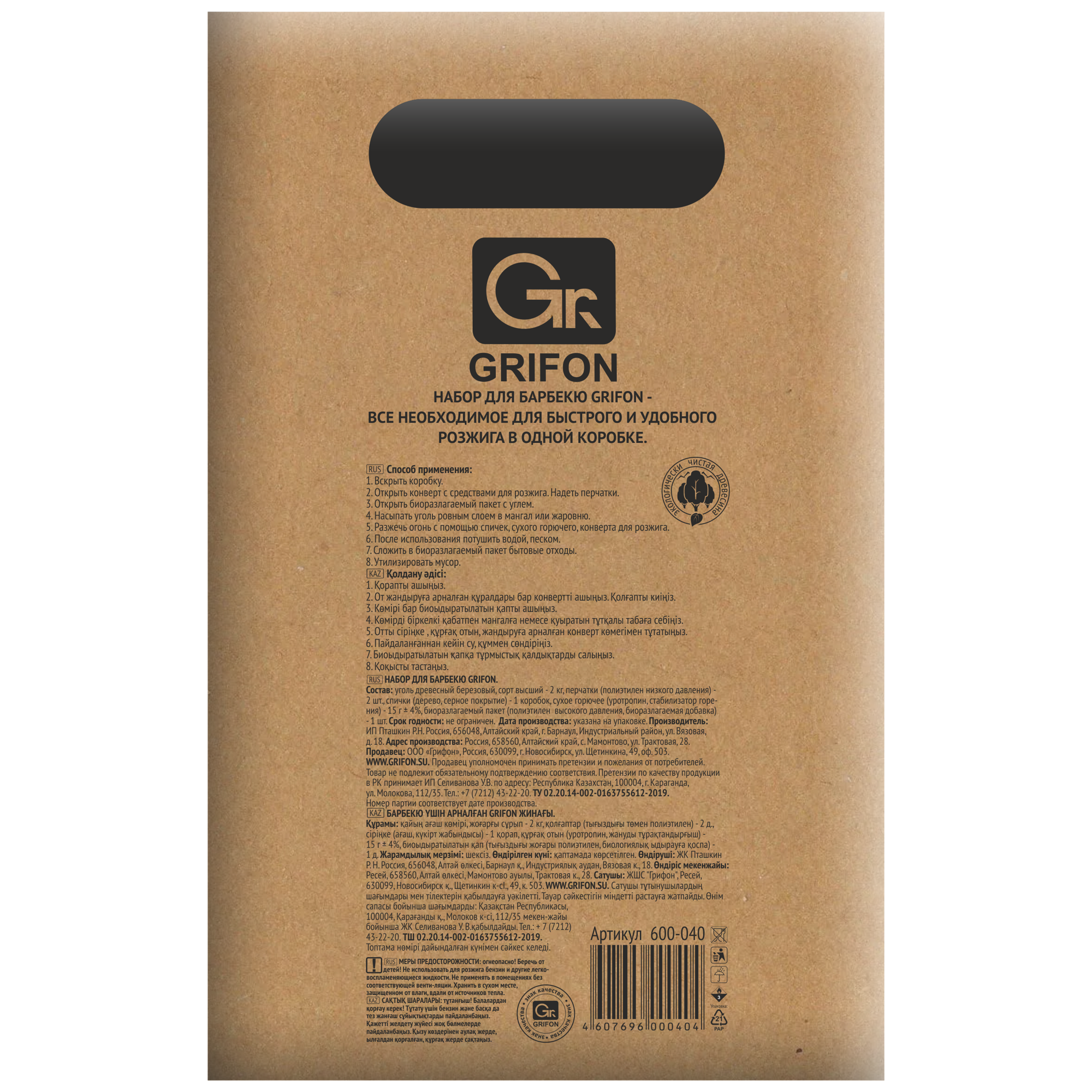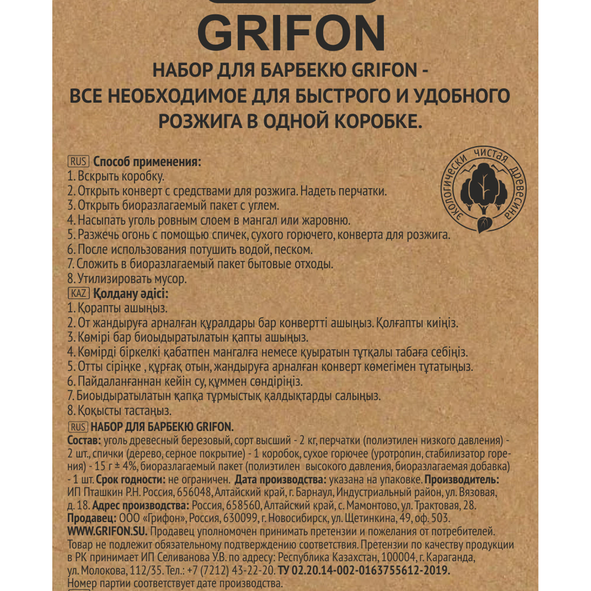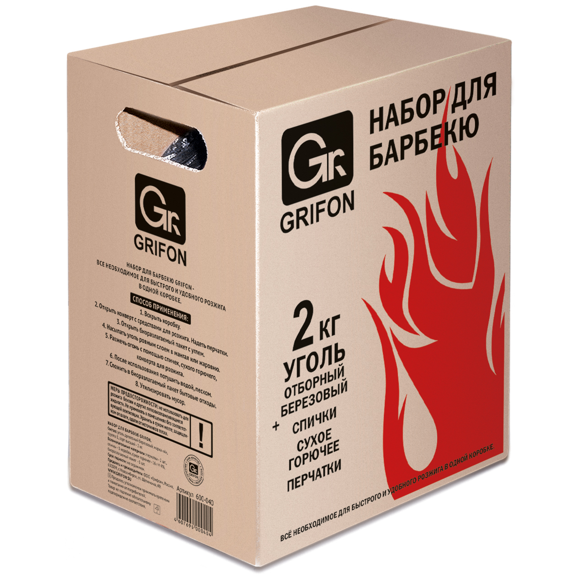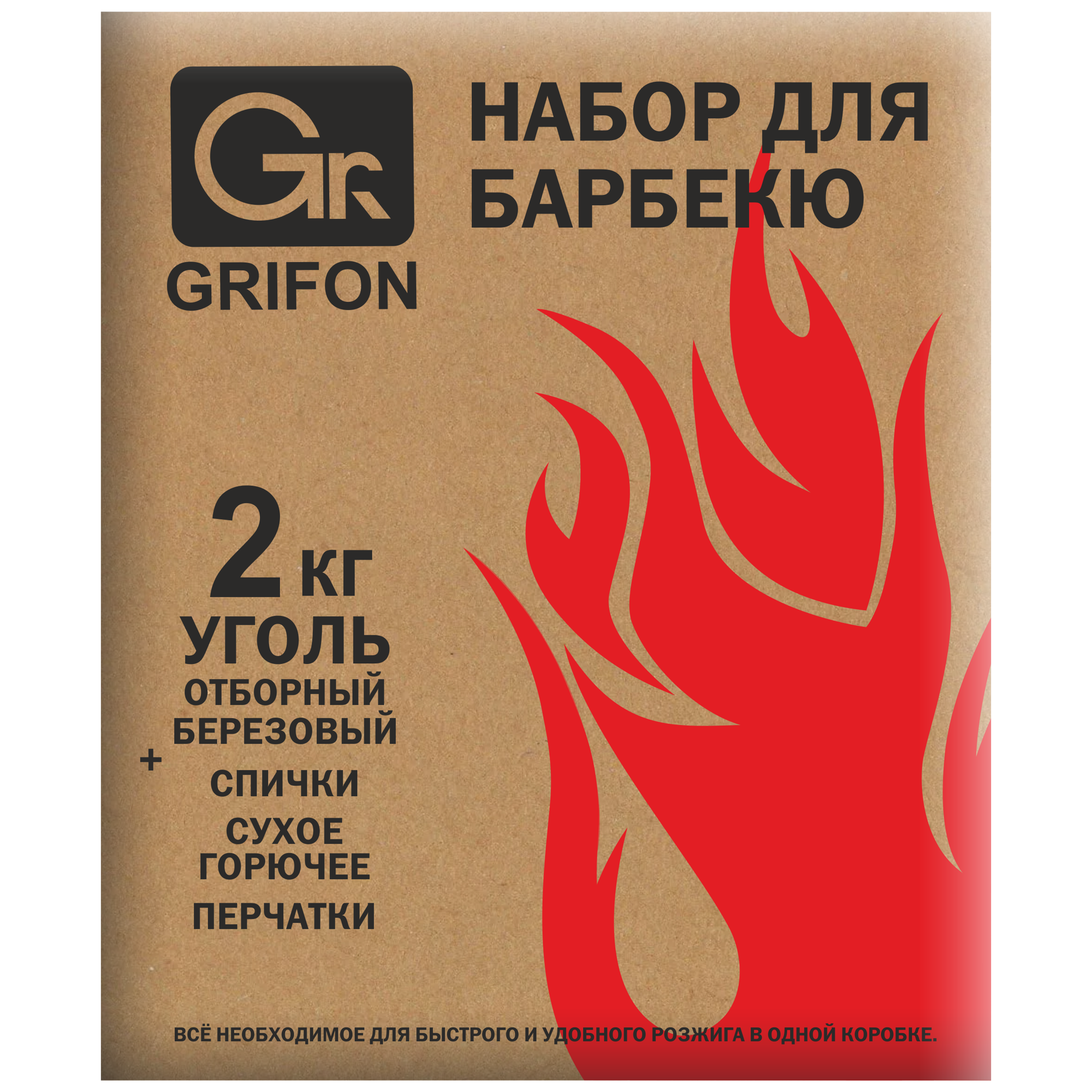 Уголь Grifon 600-040 в коробке 2 кг + перчатки спички пакет 60 л