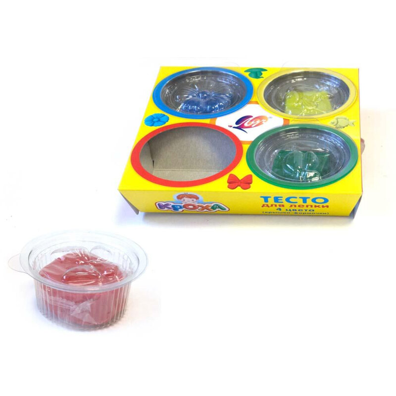 Тесто для лепки в наборе 4 цвета (синий, желтый, красный, зеленый), каждый цвет в индивидуальной баночке. На крышке каждой баночки имеется формочка для создания забавной фигурки. Набор предназначен для лепки не сложных поделок. Тесто для лепки приятное на ощупь, эластичное, легко разминается и безопасно для малышей. Работа с тестом увлекательна и очень полезна в плане раннего развития ребенка, способствует развитию мелкой моторики, координации движений и развитию речи.
