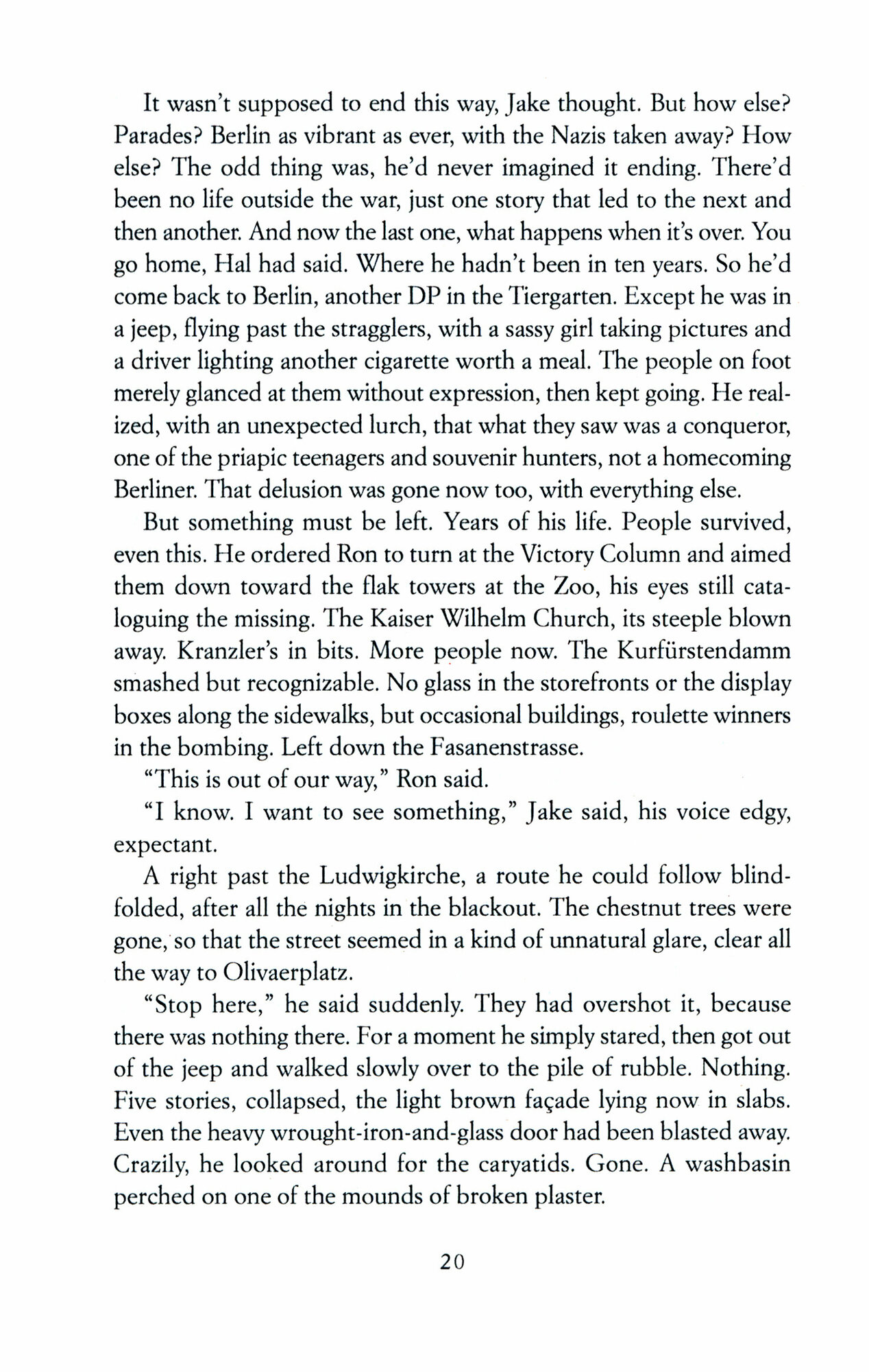 Jake Geismar cut his teeth as a foreign correspondent in pre-war Berlin. When he returns in 1945 to cover the Potsdam conference he finds the city unrecognisable - streets have vanished beneath the rubble, familiar landmarks truncated by high explosive. But amongst the ruins Berliners survive, including some he knew and, miraculously, his lost love, Lena. However, in the same way she refused to leave with him before the war, Lena won't join him now without finding her husband and Emil has disappeared from the safe care of the Americans who, turning a blind eye to his links with Hitler, want his expertise as a rocket designer for themselves.