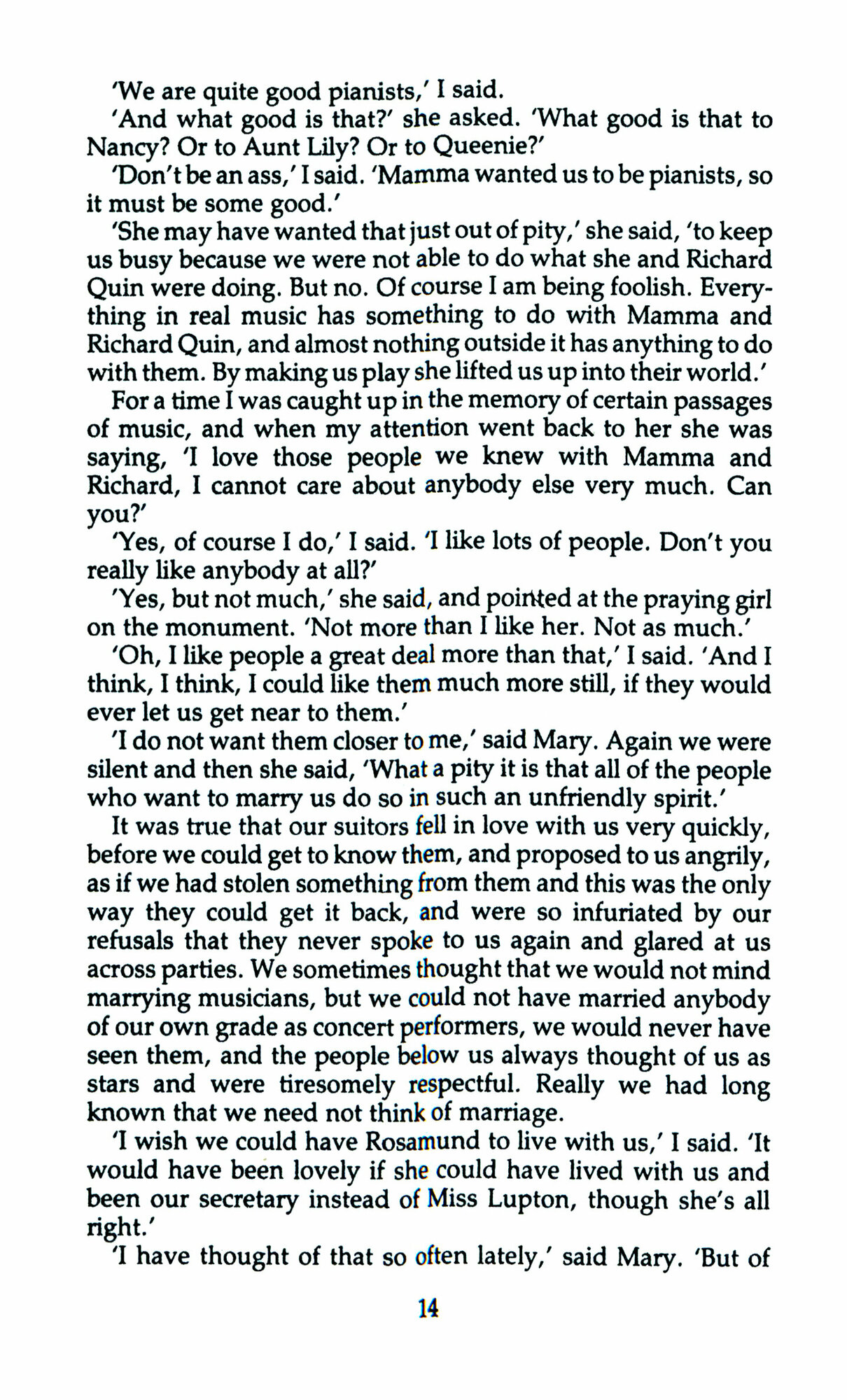 As the glitter of the 1920s gives way to the Depression, Rose and Mary find themselves feted and successful pianists. But their happiness is diminished by their cousin's unfathomable marriage to a man they perceive as grotesque. Lacking her cousin Rosamund's intuitive understanding, Rose looks to the surrogate wisdom of Mr Morpurgo, while quiet days with Aunt Lily and the Darcys at their pub on the Thames offer respite from the tensions of foreign concert tours. With approaching middle age Rose gains in perspective. Yet the most exciting development still awaits her: the discovery of and delight in her own sexuality...