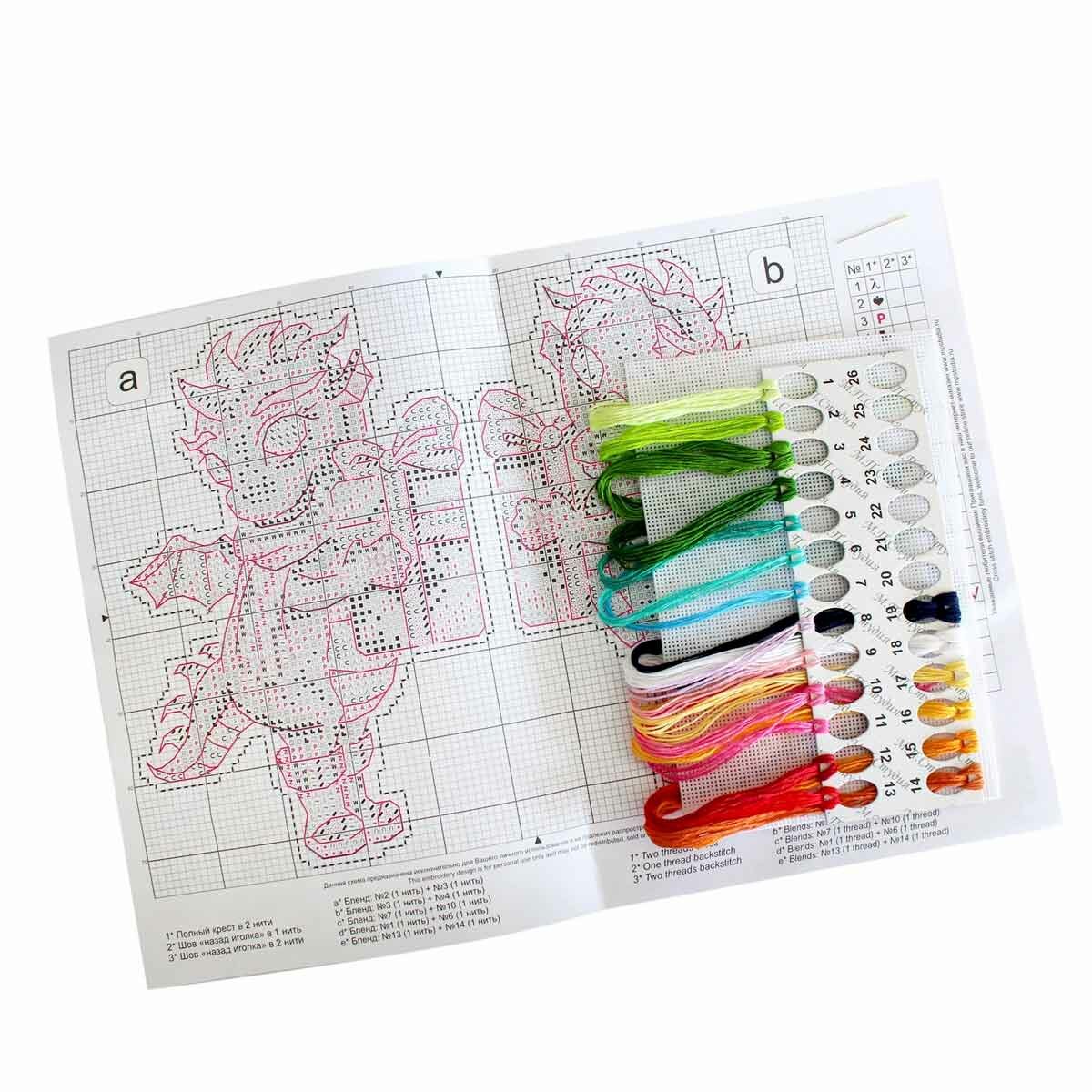 | Комплектация | пластиковая канва; нитки мулине ПНК им.Кирова; игла; схема и руководство по вышиванию |