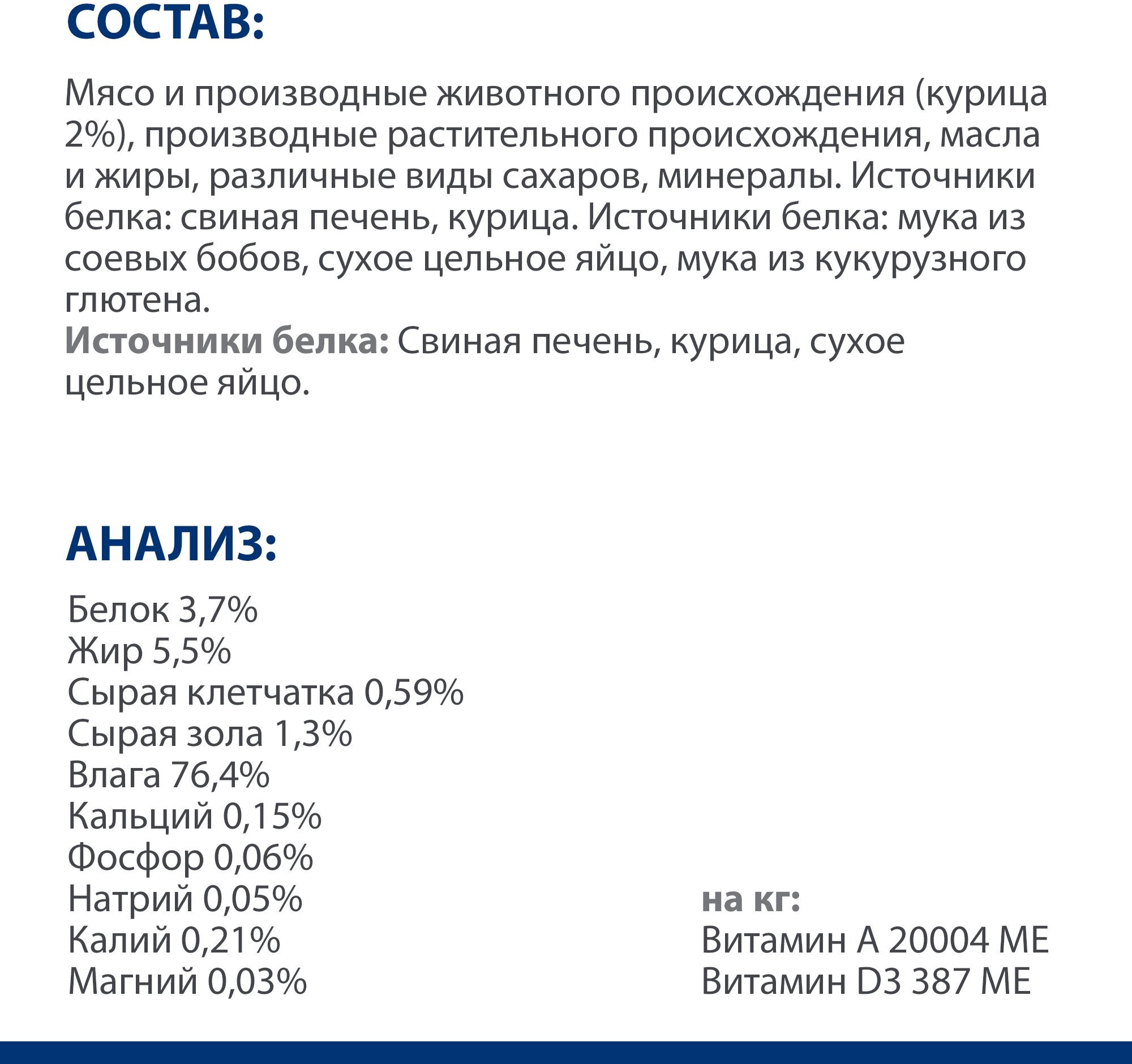 Данный корм содержит пониженный уровень белка и минералов, что снижает концентрацию уратов и цистина в моче.