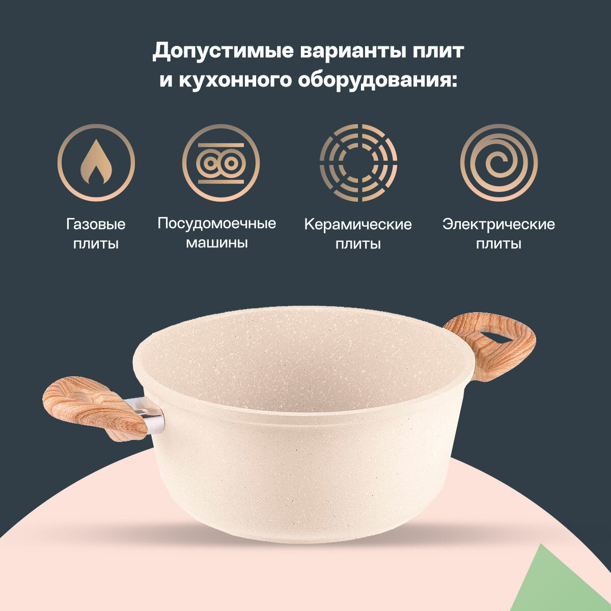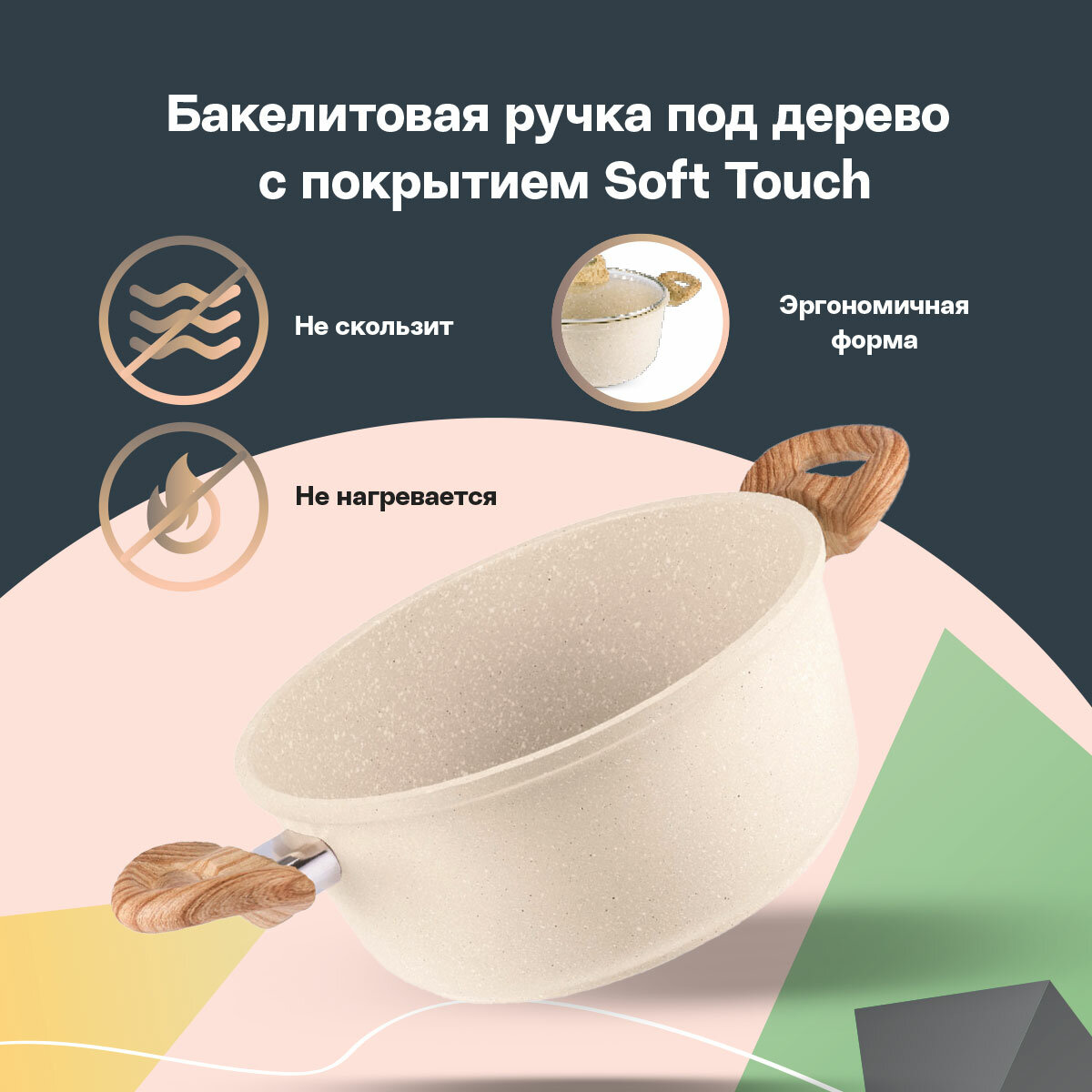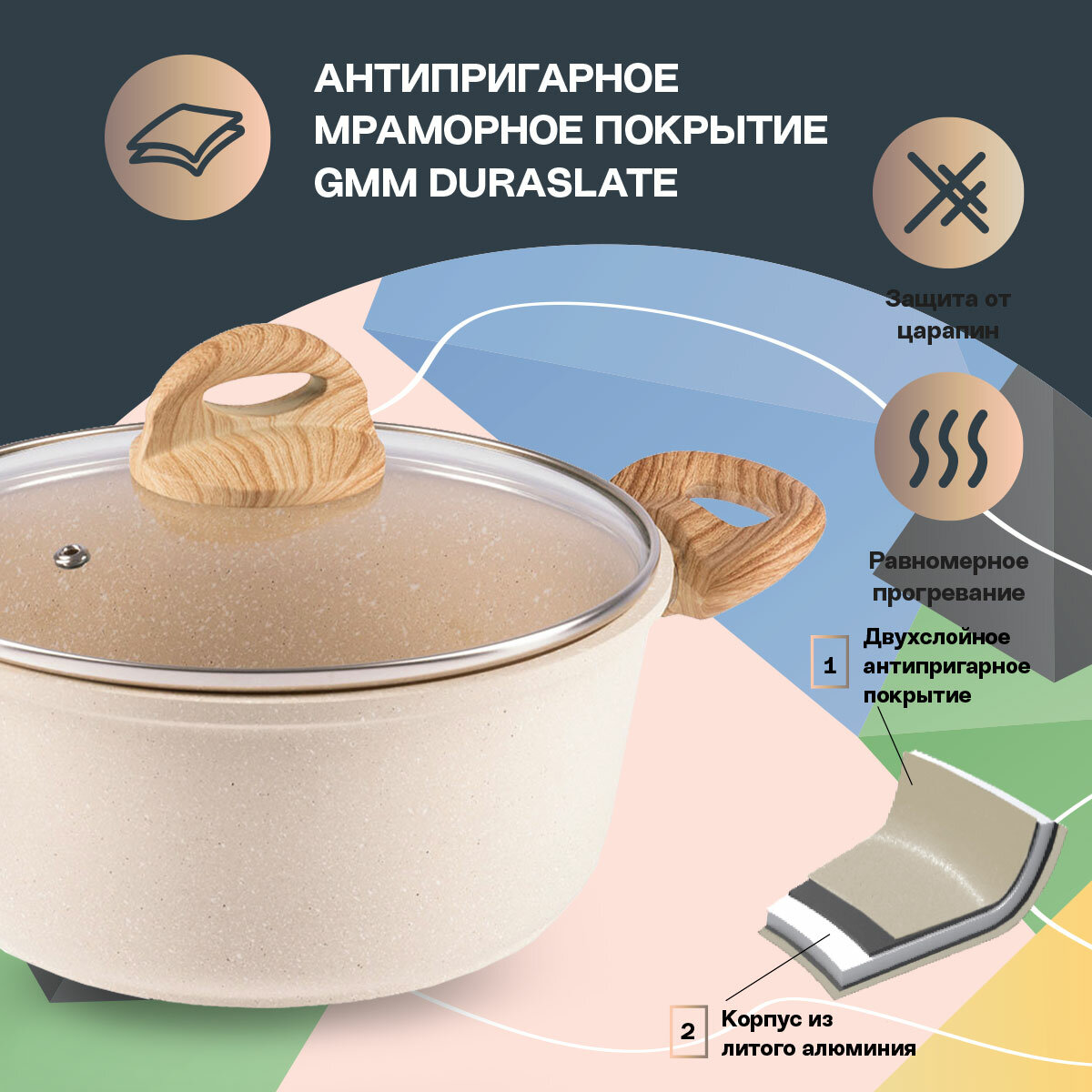 | Особенности | Антипригарное мраморное покрытие GMM DURASLATE, ручки из бакелита "под дерево". Не подходит для индукции. |