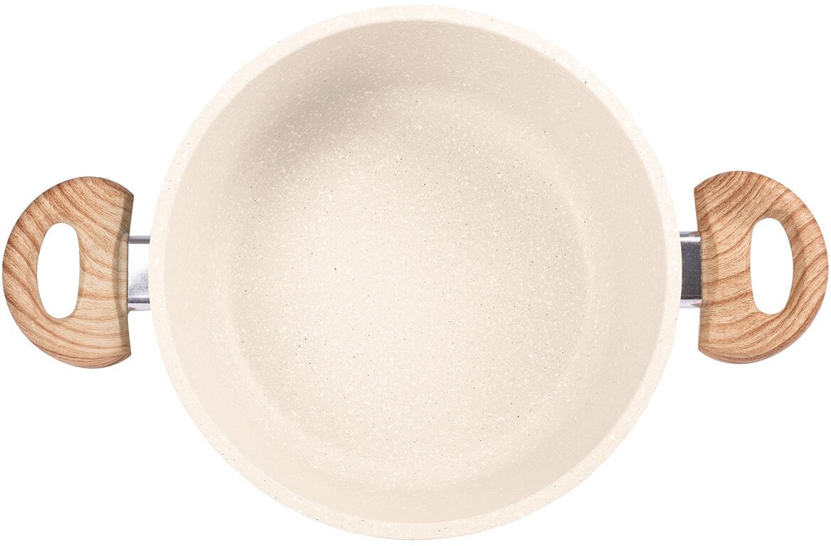 Алюминиевая кастрюля Werner Letizia 52204 диаметром 22 см в комплекте со стеклянной крышкой. Корпус кастрюли из литого алюминия придает изделию хороший запас прочности. Высота стенок 10 см, толщина дна 5 мм, объем 3.3 л, толщина стенок 2,5 мм. Кастрюля с антипригарным мраморным покрытием GMM Duraslate нежного бежевого цвета. Ручки кастрюли и крышки с винтовым креплением изготовлены из бакелита с приятным на ощупь покрытием Soft-Touch с визуальной имитацией дерева. Они обладают свойством не нагреваться при использовании кастрюли на плите и не скользить в руке. Кастрюлю можно использовать на газовых, стеклокерамических и электрических плитах. Плотно прилегающая крышка оснащена отверстием для выпуска пара.