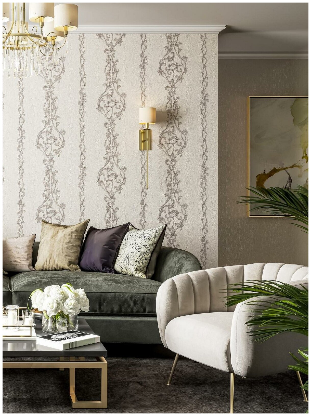 Главное преимущество коллекции – ажурные колонны, которые визуально увеличивают пространство комнаты. За основу коллекции взят оригинальный фон в виде перламутрового велюра. Благодаря своему рельефу он нежно переливается на свету, отлично скрывает неровности стен и клеится без подгона. За основу коллекции взят оригинальный фон в виде перламутрового велюра. Благодаря своему рельефу он нежно переливается на свету, отлично скрывает неровности стен и клеится без подгона.