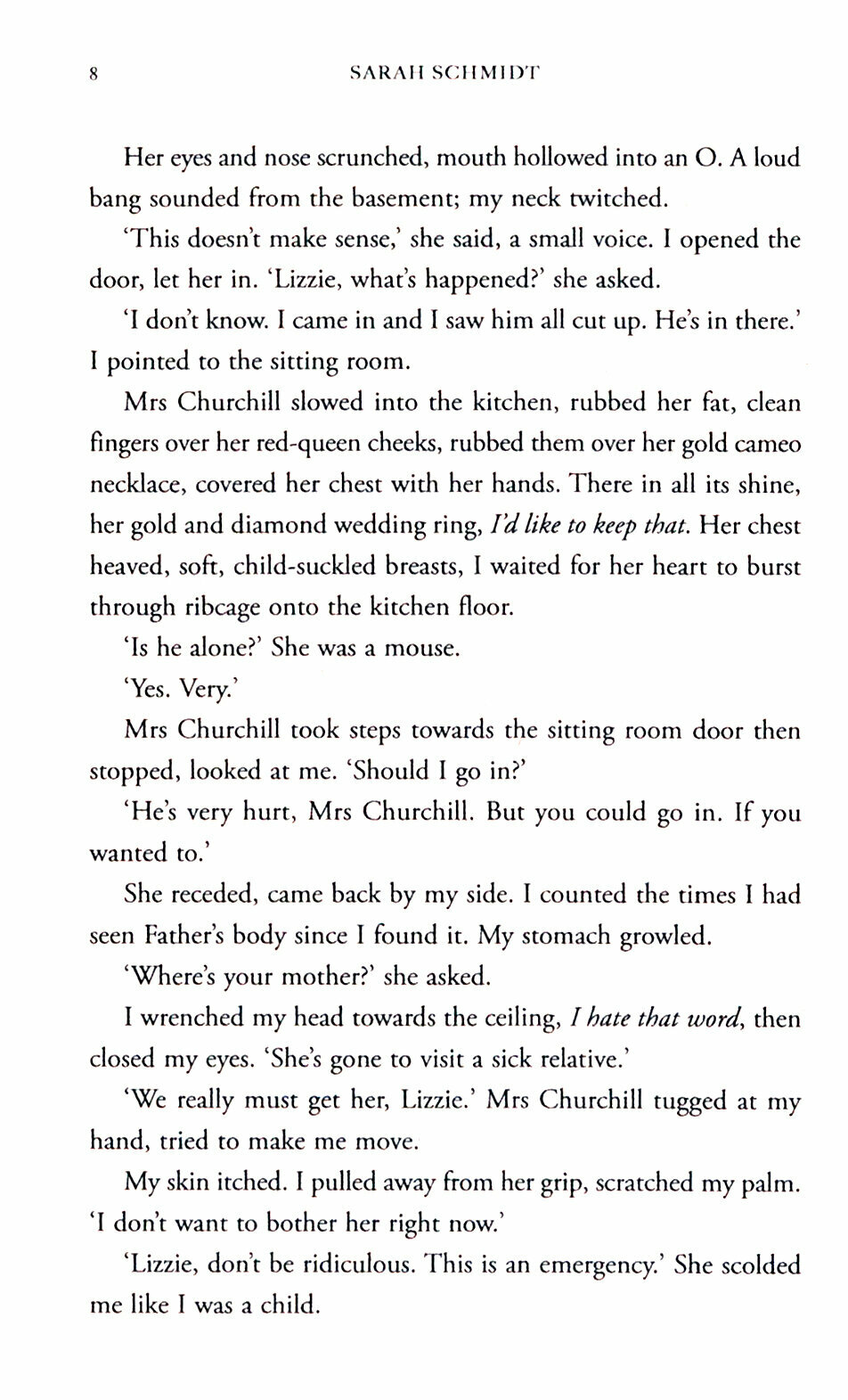 In a dazzlingly original and chilling reimagining of this most notorious of unsolved mysteries, Sarah Schmidt opens the door to the Borden home and leads us into its murkiest corners, where jealousies, slow-brewed rivalries and the darkest of thoughts reside.