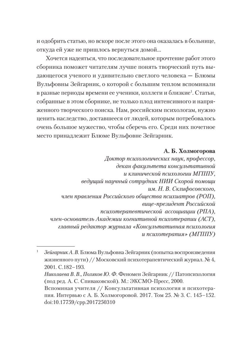 Блюма Вульфовна Зейгарник - выдающийся советский психолог, основательница московской школы клинической психологии, ученица прославленного Курта Левина и коллега А. Н. Лурии и Л. С. Выготского. В этот сборник вошли работы, которые по временному диапазону охватывают практически весь творческий путь Зейгарник. Особое место в нем занимает исследование Блюмы Вульфовны, написанное под руководством Левина, в котором описывается сделанное ею открытие, получившее название «эффект Зейгарник».