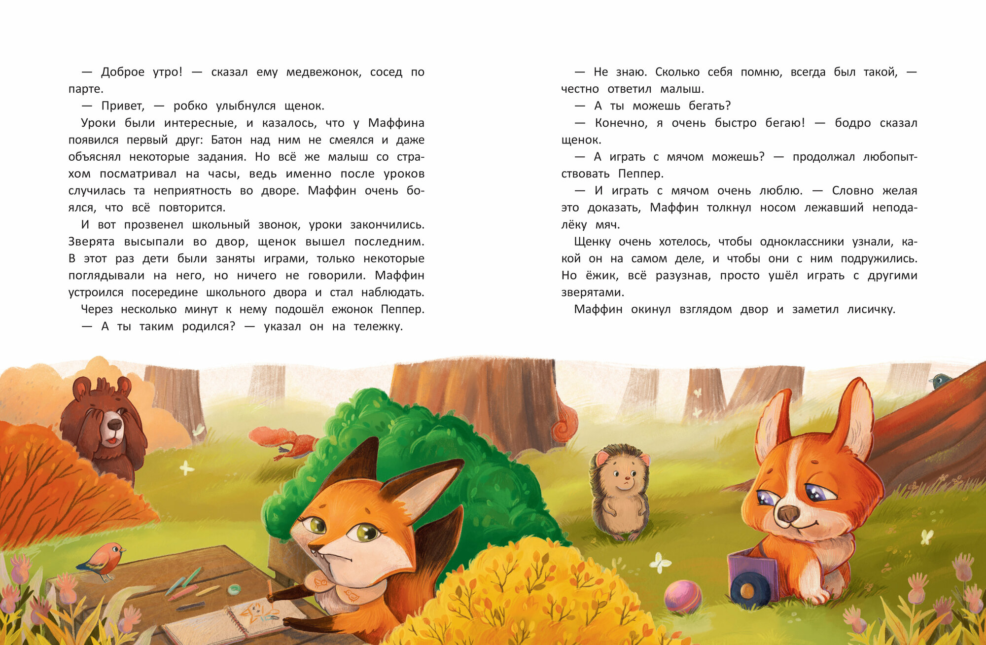 Щенок Маффин идёт в первый класс, он хочет изучать разные предметы и завести друзей. Но одноклассники избегают общения с новеньким, ведь вместо задних лап у него тележка. Маффину предстоит узнать, что порой дети остерегаются тех, кто от них отличается, и как вести себя в таких ситуациях. А его одноклассникам - что все дети особенные и наши отличия не означают, что мы не сможем дружить и играть вместе.