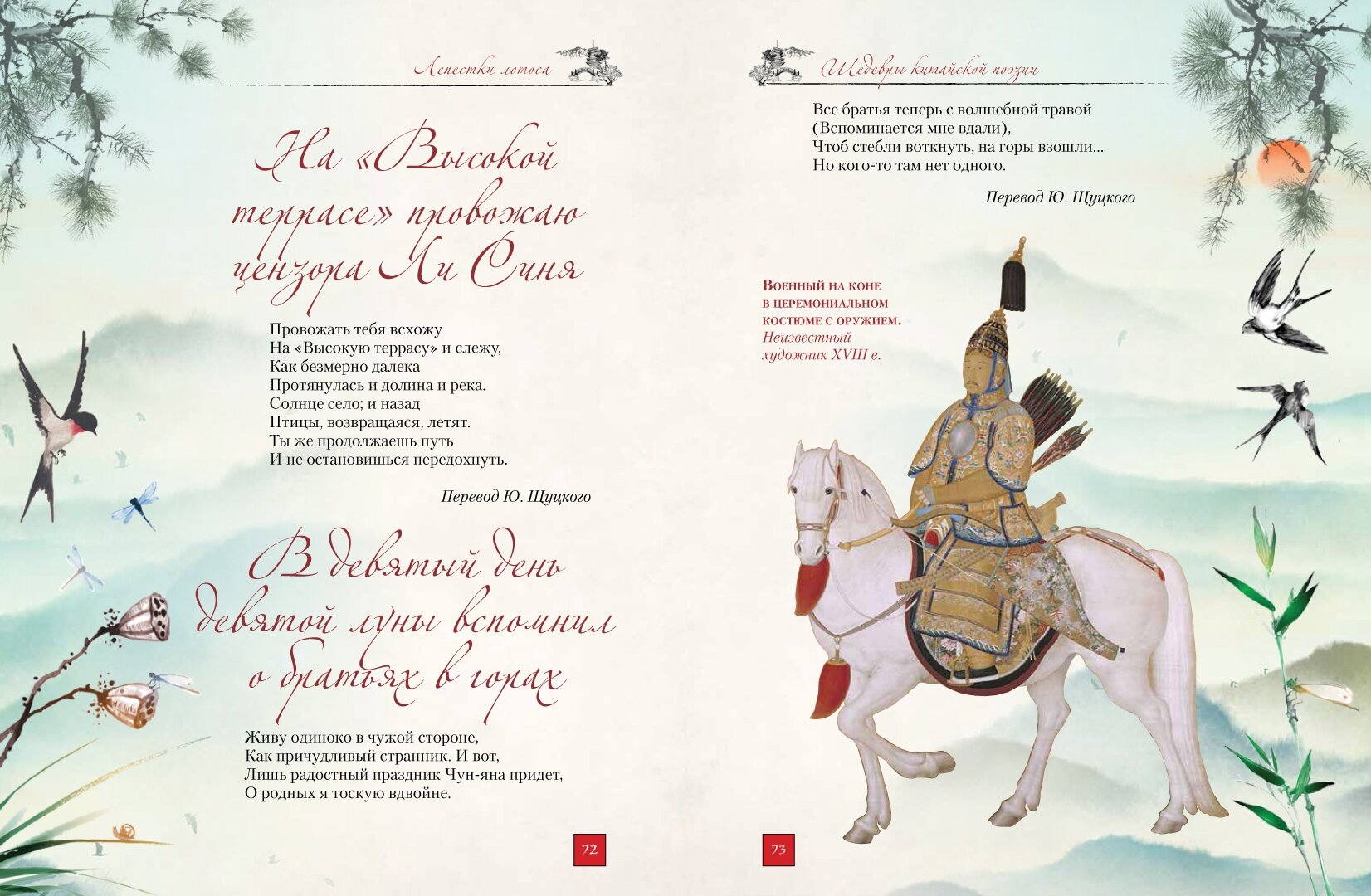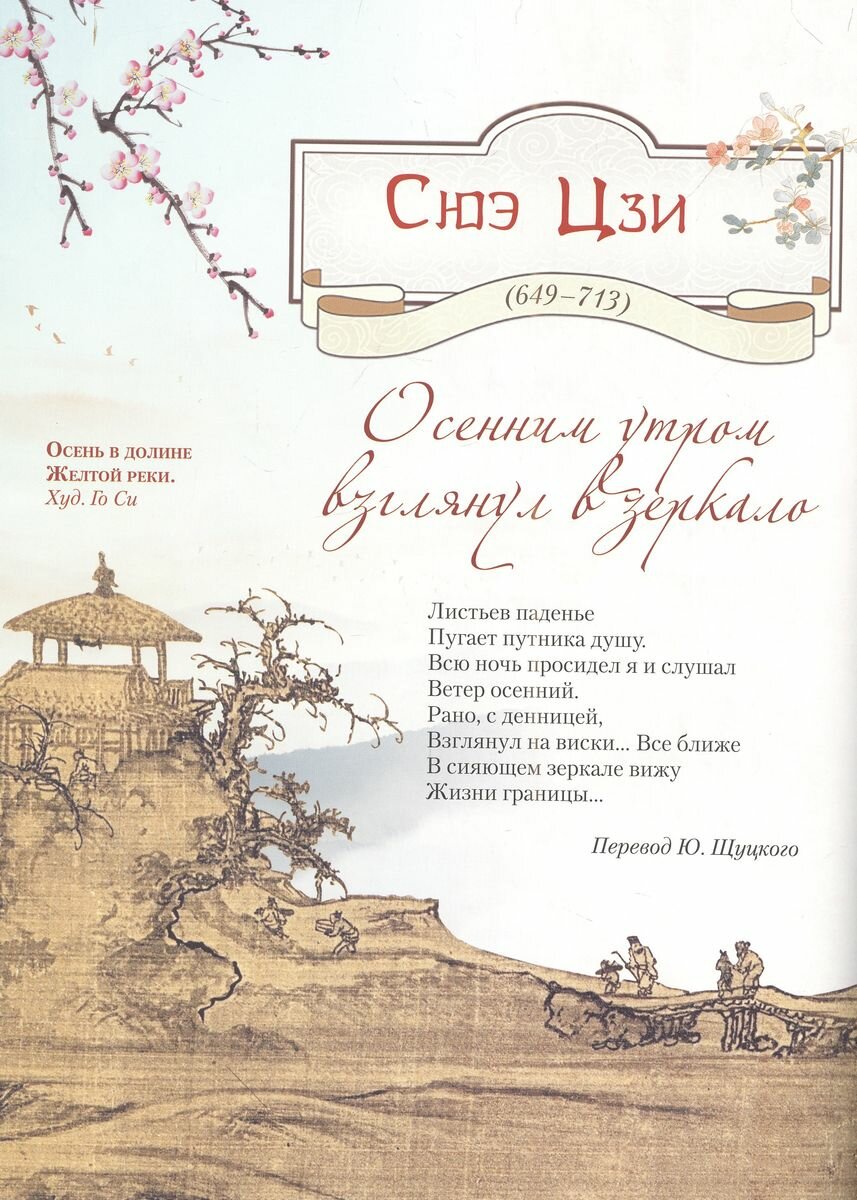 Мудрость и поэтические традиции Поднебесной империи с глубиной чувств, богатством и изысканностью русского языка. Китайская поэзия покорила наших читателей в разгар "Золотого века" русской литературы: первый перевод китайского стихотворения на русский язык принадлежит перу Афанасия Фета (его "Тень" была опубликована в 1856 году).