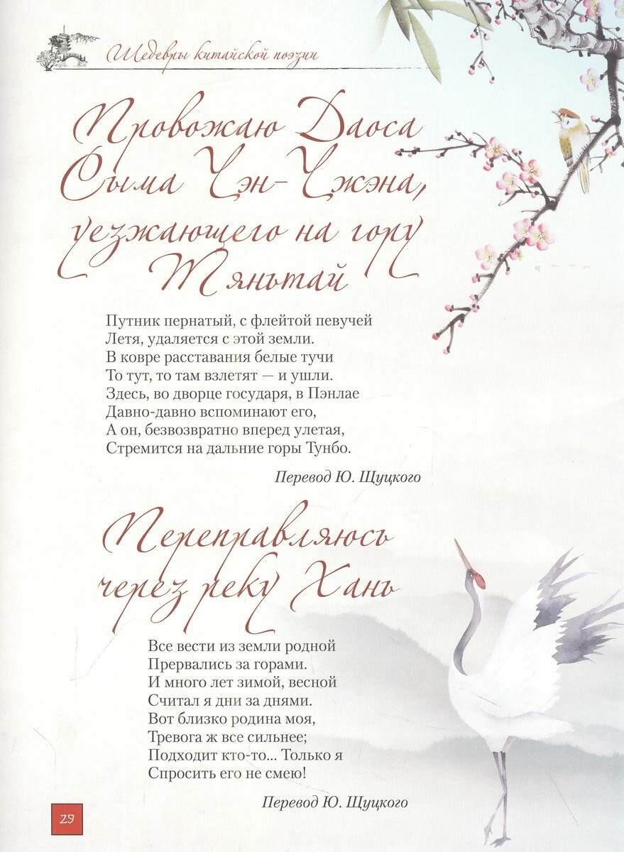 Китайская поэзия у нас очень мало известна, а между тем она чрезвычайно богата и, извините за тавтологию, поэтична. Рекомендую эту книгу не только тем, кто стремится поглубже познакомиться с китайской культурой, но и тем, кто просто желает отвлечься от повседневных будней и погрузиться в мир красоты и изящества.