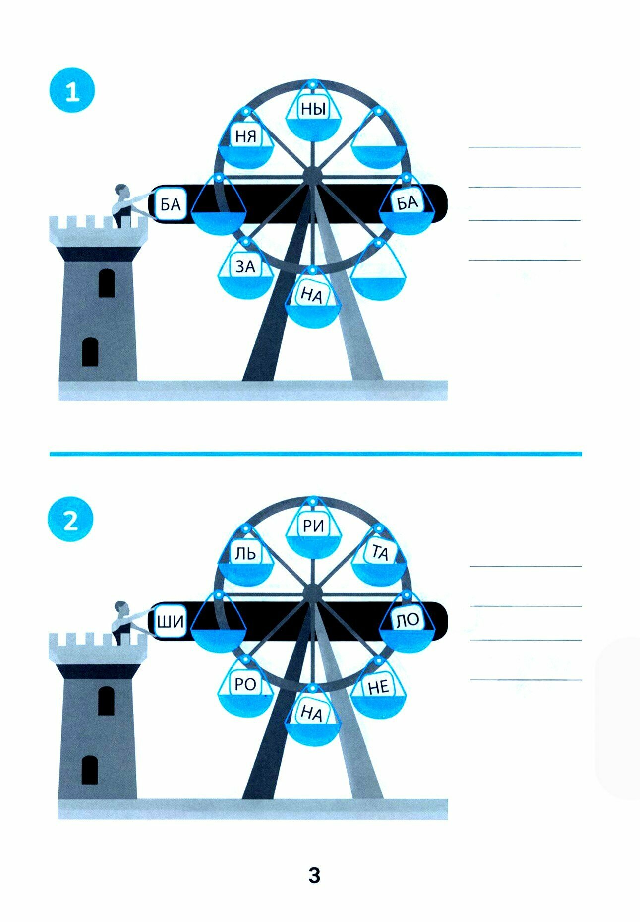 Смотритель на башне демонстрирует карточку с буквой или слогом, а в корзинах карусели волшебным образом появляются карточки с другими буквами или слогами. Нужно назвать и записать все правильные слова, которые возникнут в выделенной полосе при вращении карусели по часовой стрелке.