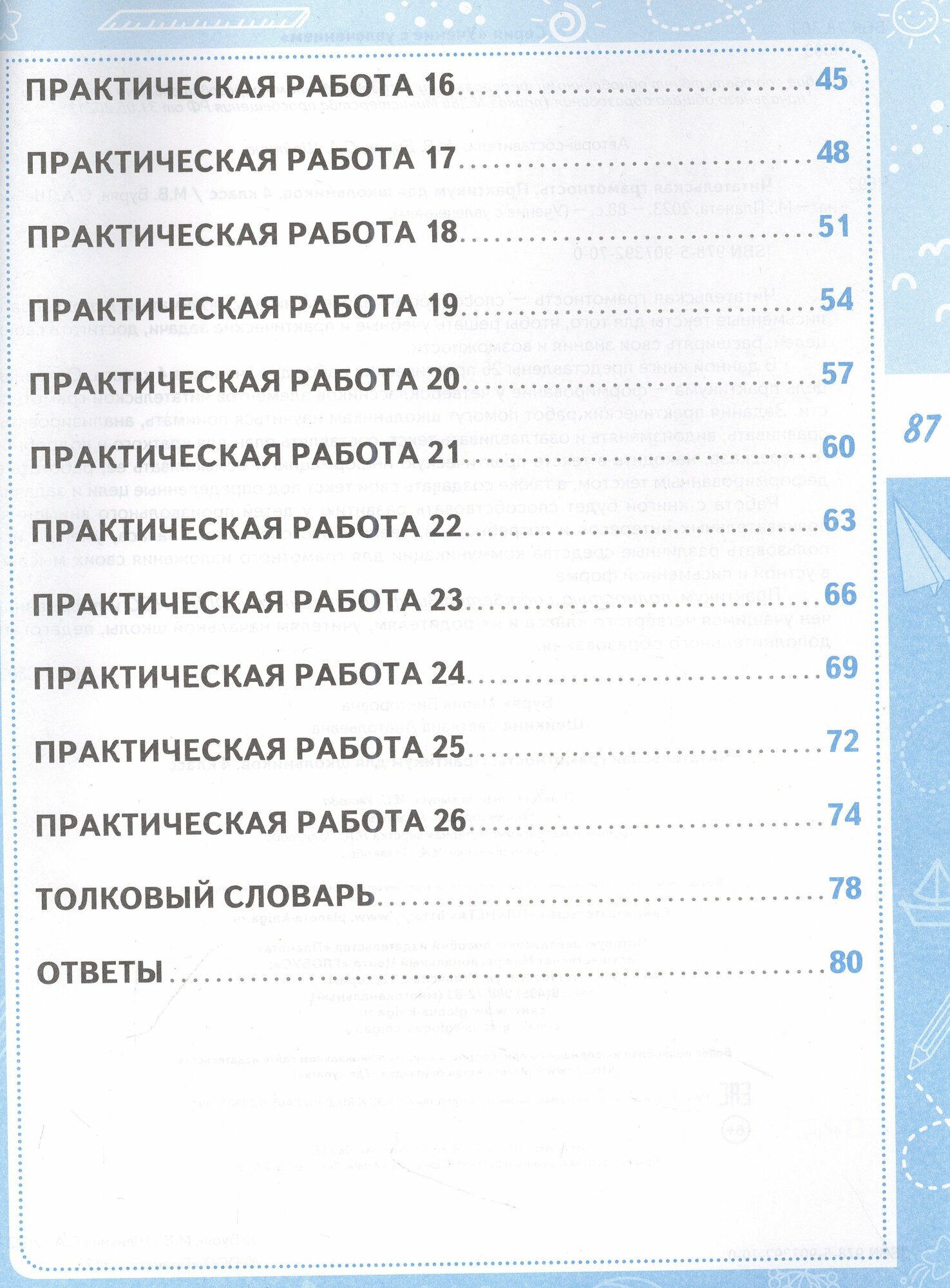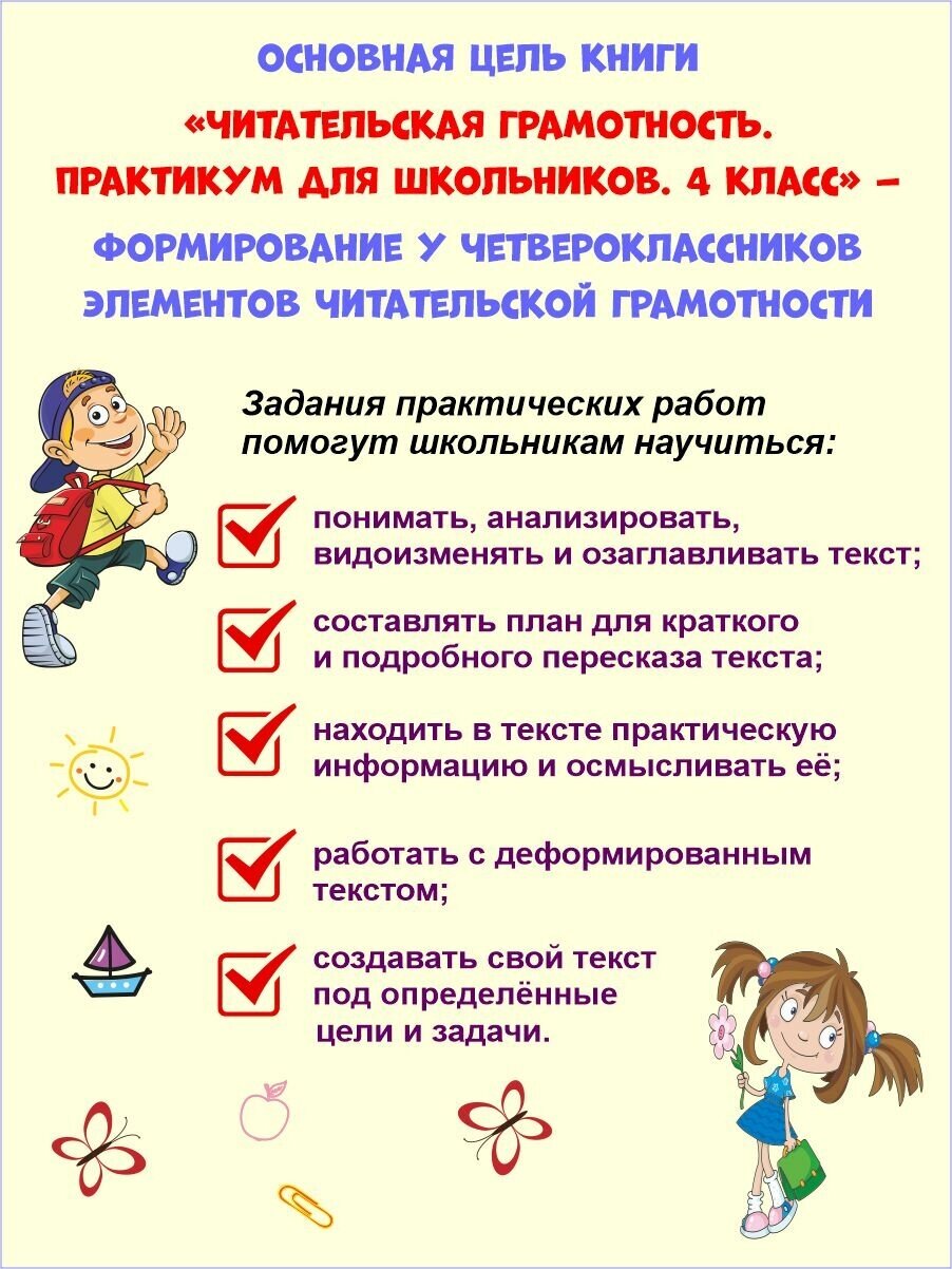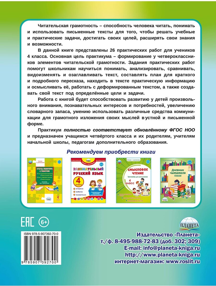 В данной книге представлены 26 практических работ для учеников 4 класса. Основная цель практикума — формирование у четвероклассников элементов читательской грамотности. Задания практических работ помогут школьникам научиться понимать, анализировать, сравнивать, видоизменять и озаглавливать текст, составлять план для краткого и подрбного пересказа, находить в тексте практическую информацию и осмысливать её, работ деформированным текстом, а также создавать свой текст под определенные цели и задачи.