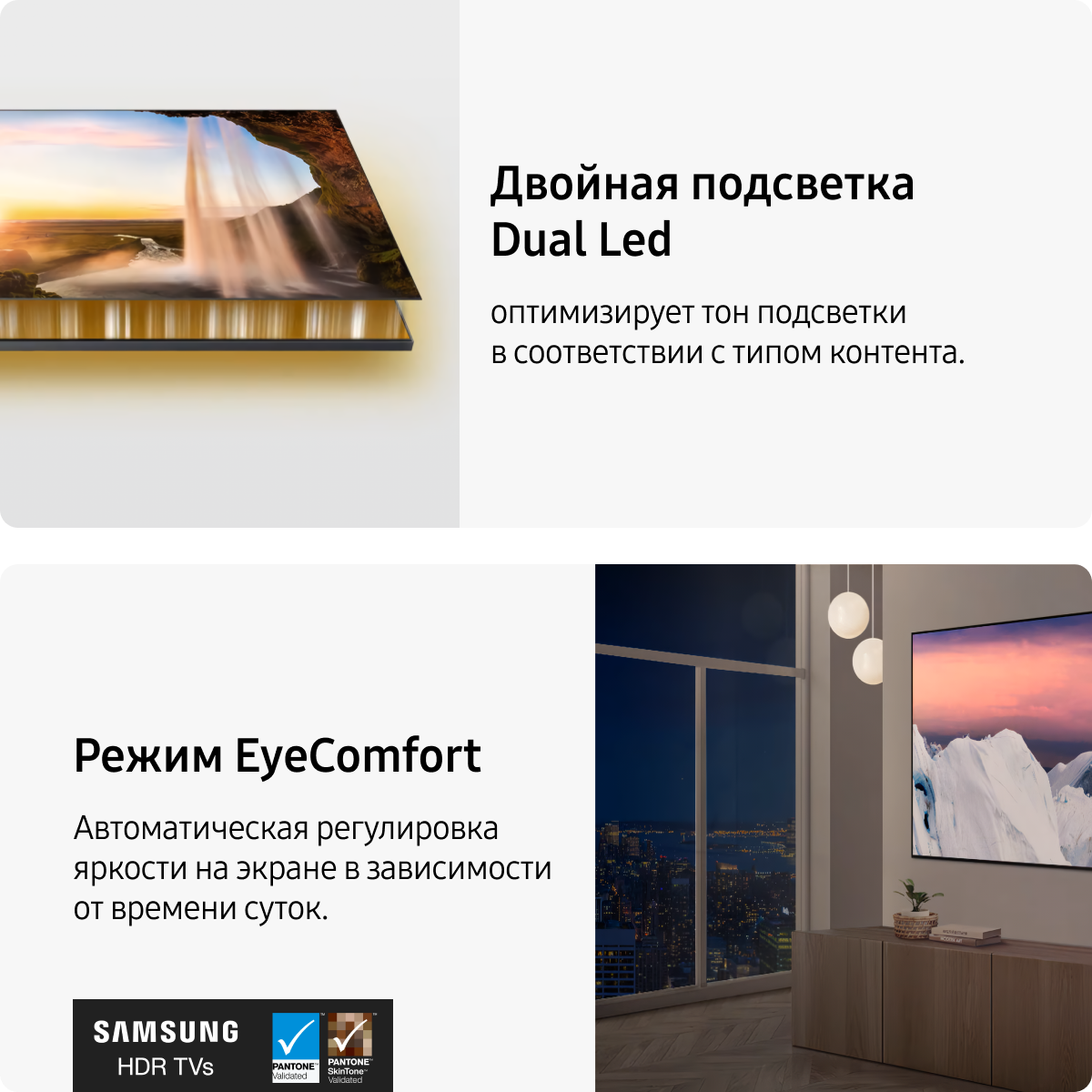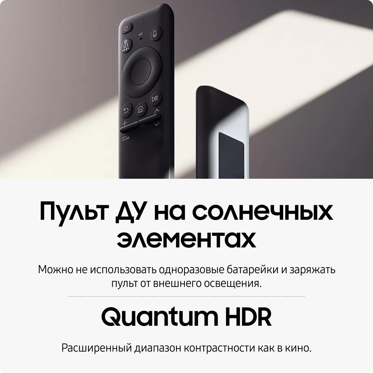 Телевизор QLED Samsung QE65Q70CAUXRU демонстрирует изображение в разрешении 4K UltraHD. Это первый в мире телевизор, получивший сертификацию от компании PANTONE, самого известного авторитета в области сертификации цвета. Теперь вы можете наслаждаться более реалистиным и комфортным для глаз изображением. Интеллектуальный процессор Quantum 4K оптимизирует изображение и звук, чтобы обеспечить захватывающий опыт просмотра. Благодаря функции Motion Xcelerator Turbo+ в телевизоре представлено исключительное качество передачи движения в формате 4K 120 Гц, вы сможете наслаждаться плавностью игровых сцен без задержек. Динамическая оптимизация цветовых тонов с помощью технологии HDR10 обеспечивает более глубокие оттенки чёрного и белого. Smart Hub оптимизирует подбор контента, благодаря чему вы тратите меньше времени на поиск и больше времени на просмотр фильмов, любимых программ или игр. В режиме EyeComfort автоматически регулируется яркость и цвета объектов на экране в зависимости от времени суток, что снимает усталость и напряжение глаз. Наслаждайтесь более реалистичными цветами и чёткой контрастностью благодаря технологии двойной подсветки Dual LED, которая оптимизирует тон подсветки в соответствии с типом просматриваемого контента. Технология OTS Lite: объёмный иммерсивный звук с виртуальными верхними динамиками позволит полностью погрузиться в происходящее на экран. Уникальная технология Q-Symphony позволяет динамикам телевизора и саундбара работать синхронно без отключения ТВ динамиков, что обеспечивает более гармоничное звуковое сопровождение изображения. Использование технологии AMD FreeSync позволяет снизить эффекты торможения и разрыва изображения. Телевизоры сертифицированные по технологии AMD FreeSync Premium Pro Tier поддерживают игровой режим с поддержкой формата HDR. Наслаждайтесь просмотром, а об остальном позаботится умный помощник. Приложение SmartThings может легко подключаться к смарт-устройствам, отслеживать и контролировать их, чтобы обеспечить интуитивно-понятное управление умным домом через встроенный хаб.