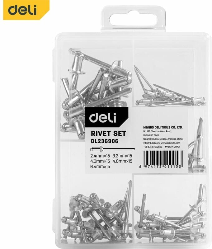 Набор заклепок Deli DL236906 75 шт (2.4мм,3.2мм,4.0мм,4.8мм,6.0мм) * 15 шт Пластиковая коробка.