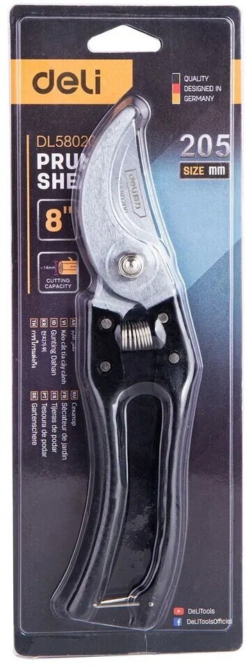Секатор Deli DL580200 Размер 205 мм. Макс диаметр резки 14 мм. Сталь 65 MN. Ручка из ПВХ.