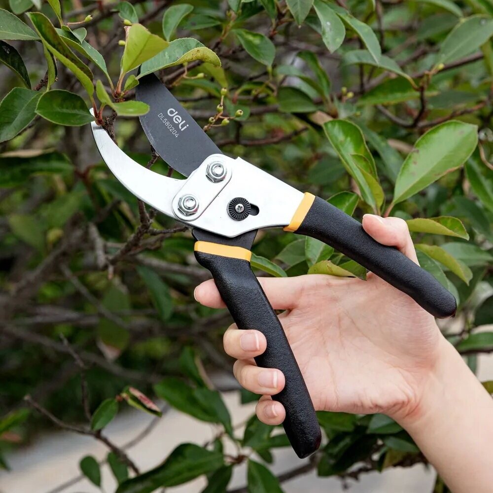 Секатор Deli DL580204 Размер 200 мм. Макс диаметр резки 15 мм. Сталь 55С. Термообработанная поверхность. Тефлоновая уплотнённая пластиковая ручка.