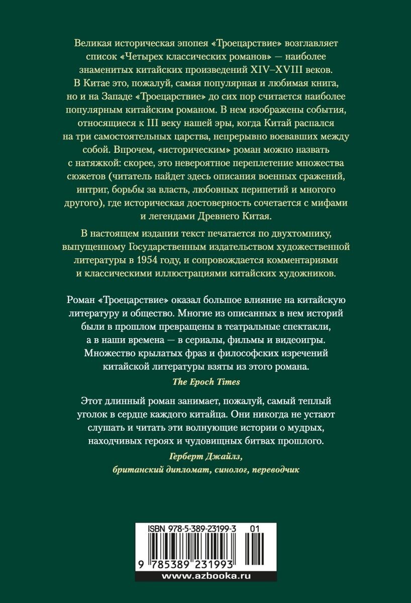 Великая историческая эпопея «Троецарствие» возглавляет список «Четырех классических романов» — наиболее знаменитых китайских произведений XIV—XVIII веков. В Китае это, пожалуй, самая популярная и любимая книга, но и на Западе «Троецарствие» до сих пор считается наиболее популярным китайским романом. В нем изображены события, относящиеся к III веку нашей эры, когда Китай распался на три самостоятельных царства, непрерывно воевавших между собой. Впрочем, «историческим» роман можно назвать с натяжкой: скорее, это невероятное переплетение множества сюжетов (читатель найдет здесь описания военных сражений, интриг, борьбы за власть, любовных перипетий и многого другого), где историческая достоверность сочетается с мифами и легендами Древнего Китая. В настоящем издании текст печатается по двухтомнику, выпущенному Государственным издательством художественной литературы в 1954 году, и сопровождается комментариями и классическими иллюстрациями китайских художников.