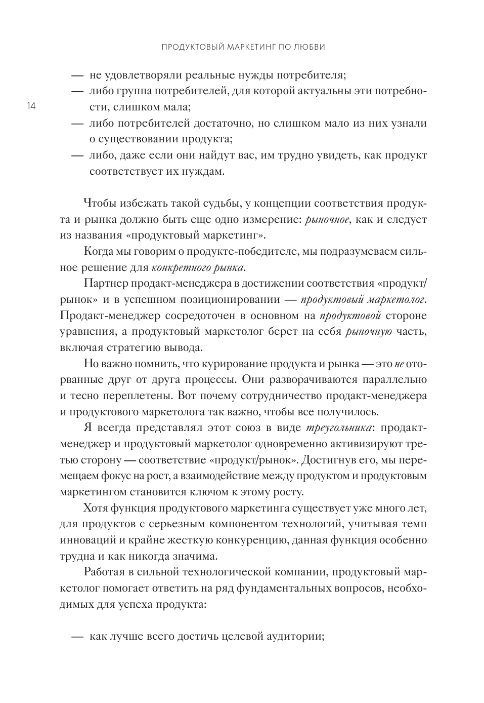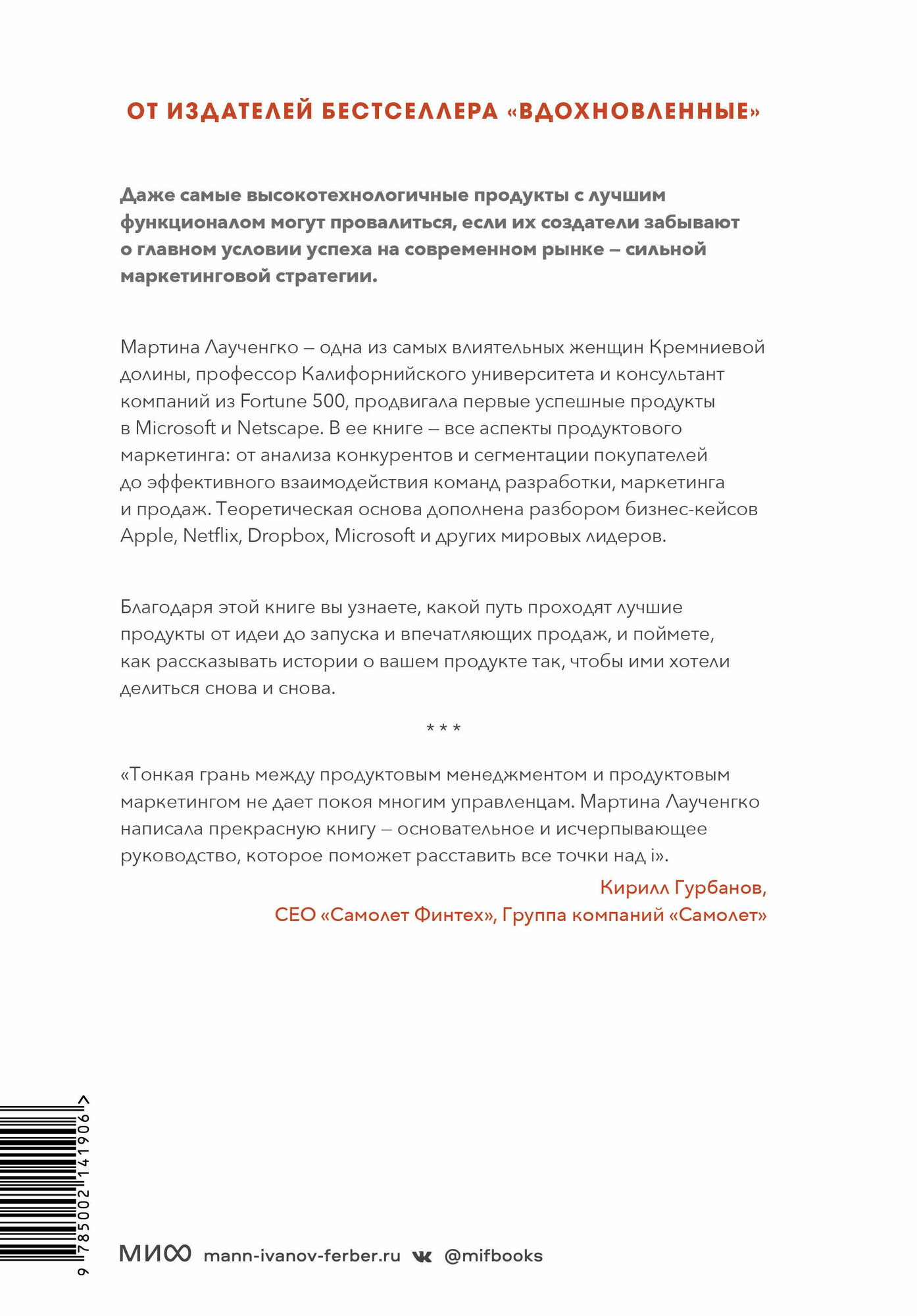 Обширное руководство по продуктовому маркетингу от одной из самых влиятельных женщин Кремниевой долины. Поможет вам рассказывать истории о вашем продукте так, чтобы ими хотели делиться снова и снова.Даже самые высокотехнологичные продукты с лучшим функционалом могут провалиться, если их создатели забывают о главном условии успеха на современном рынке — сильной маркетинговой стратегии.Мартина Лаученгко — одна из самых влиятельных женщин Кремниевой долины, профессор Калифорнийского университета и консультант компаний из Fortune 500, продвигала первые успешные продукты в Microsoft и Netscape. В ее книге — все аспекты продуктового маркетинга: от анализа конкурентов и сегментации покупателей до эффективного взаимодействия команд разработки, маркетинга и продаж.Теоретическая основа дополнена разбором бизнес-кейсов Apple, Netflix, Dropbox, Microsoft и других мировых лидеров. Благодаря этой книге вы узнаете, какой путь проходят лучшие продукты от идеи до запуска и впечатляющих продаж.Для кого эта книга:Эта книга будет полезна продуктовым маркетологам, а также всем, кто хочет преобразовать продуктовый маркетинг в своей компании и добиться выдающихся результатов.