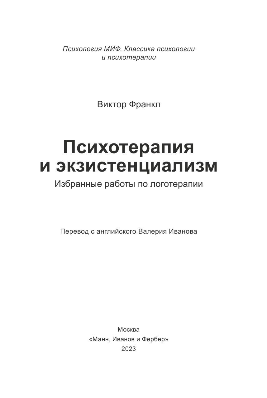 Психотерапия и экзистенциализм. Избранные работы по логотерапии (Виктор Эмиль Франкл); Манн, Иванов и Фербер, 2023