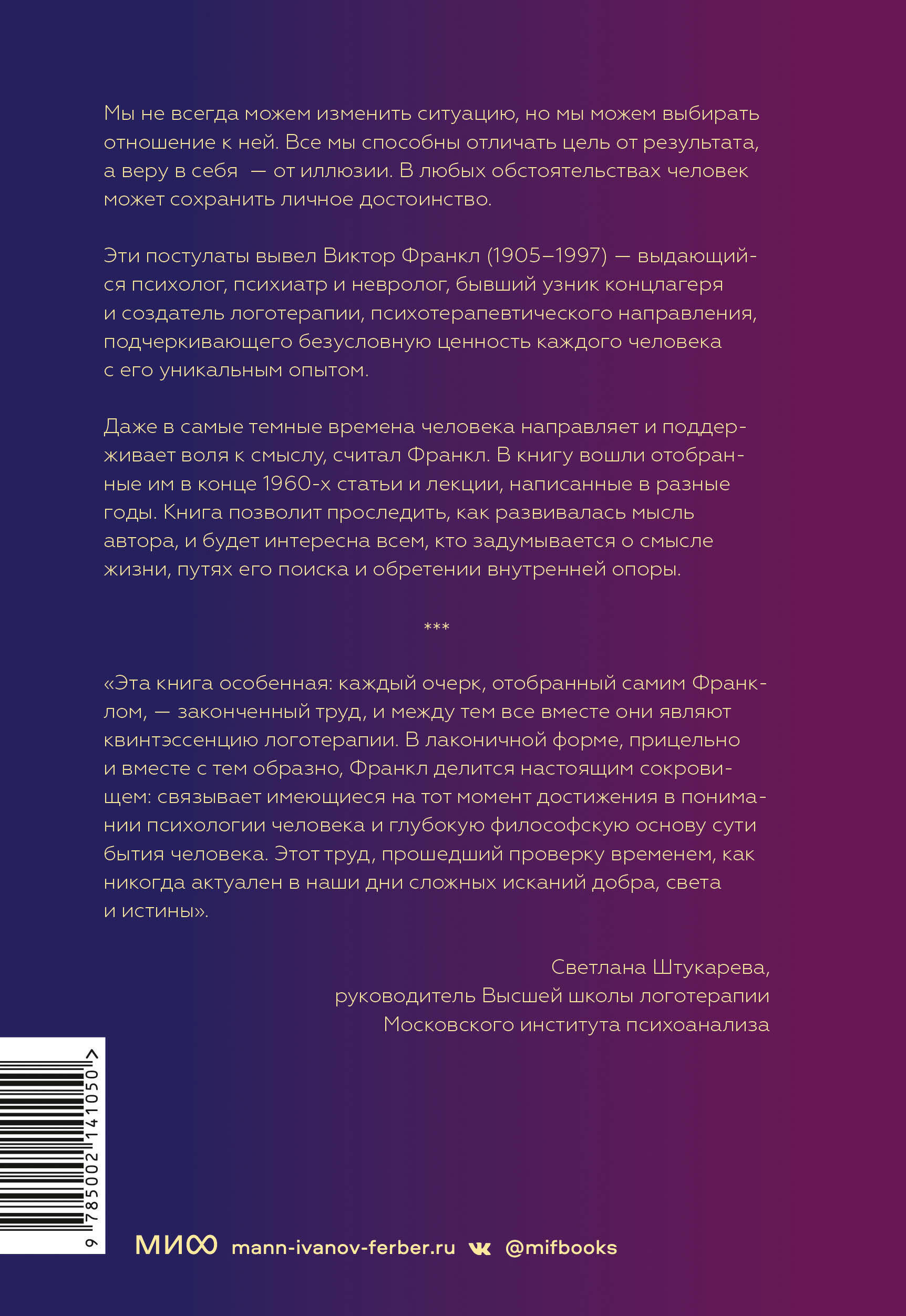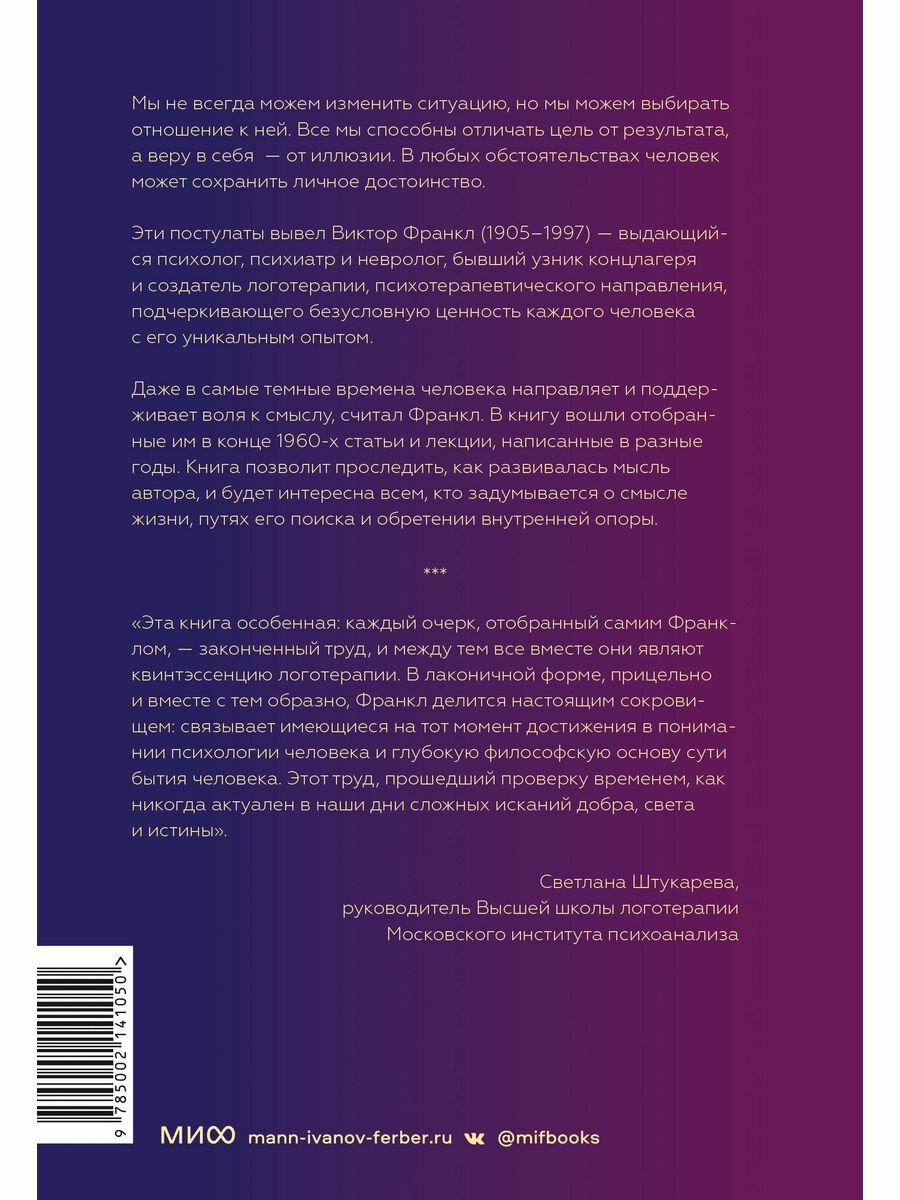 Эта книга, информативная, глубокая и человечная, с одной стороны, раскрывает суть логотерапии, а с другой — вдохновляет, обнадеживает и заставляет задуматься. И точно не оставит равнодушным.