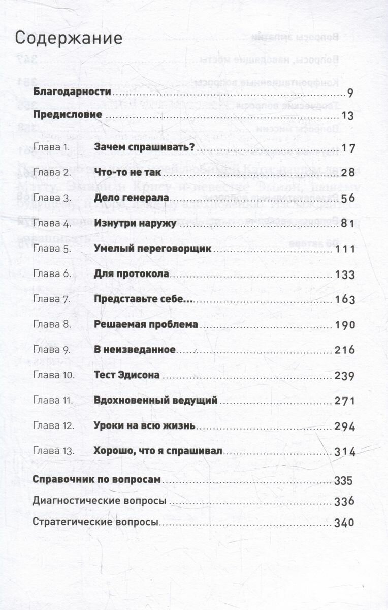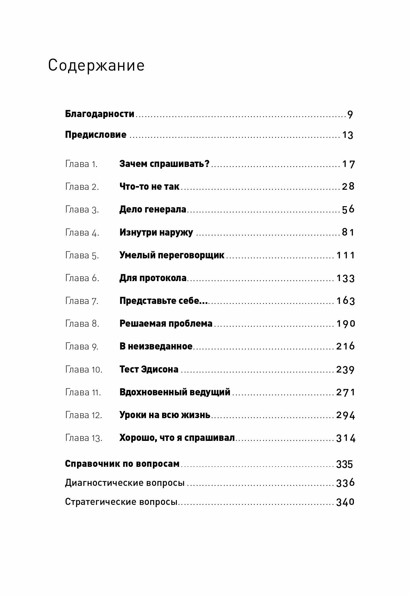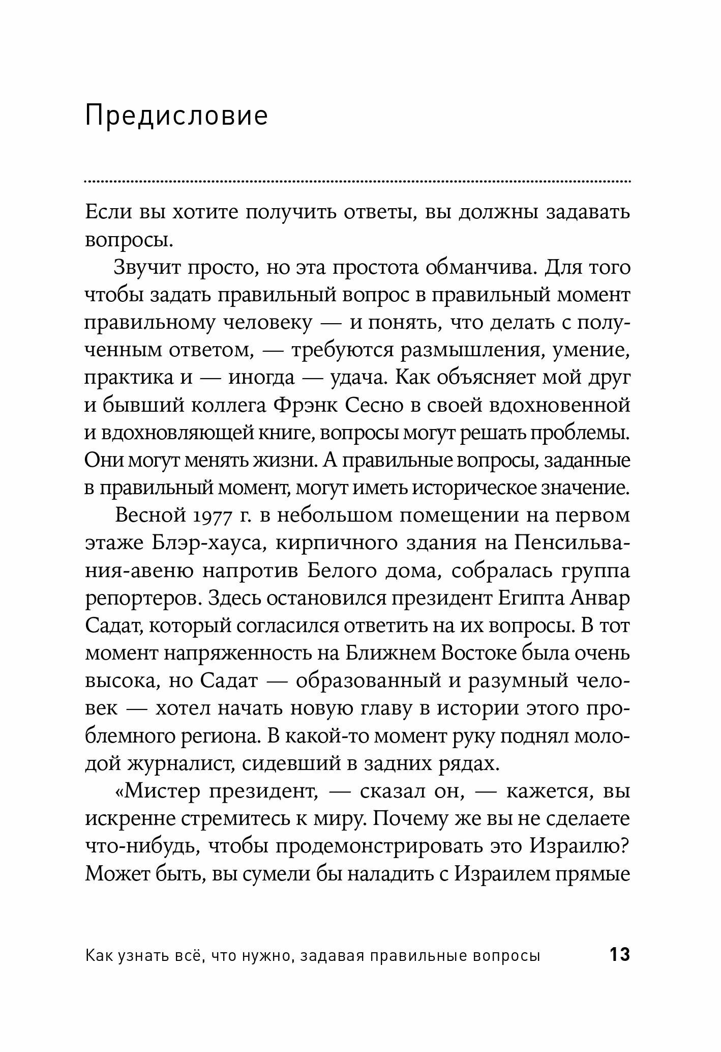 «Если вы хотите получить ответы, вы должны задавать вопросы. Звучит просто, но эта простота обманчива. Для того чтобы задать правильный вопрос в правильный момент правильному человеку — и понять, что делать с полученным ответом, — требуются размышления, умение, практика и — иногда — удача».