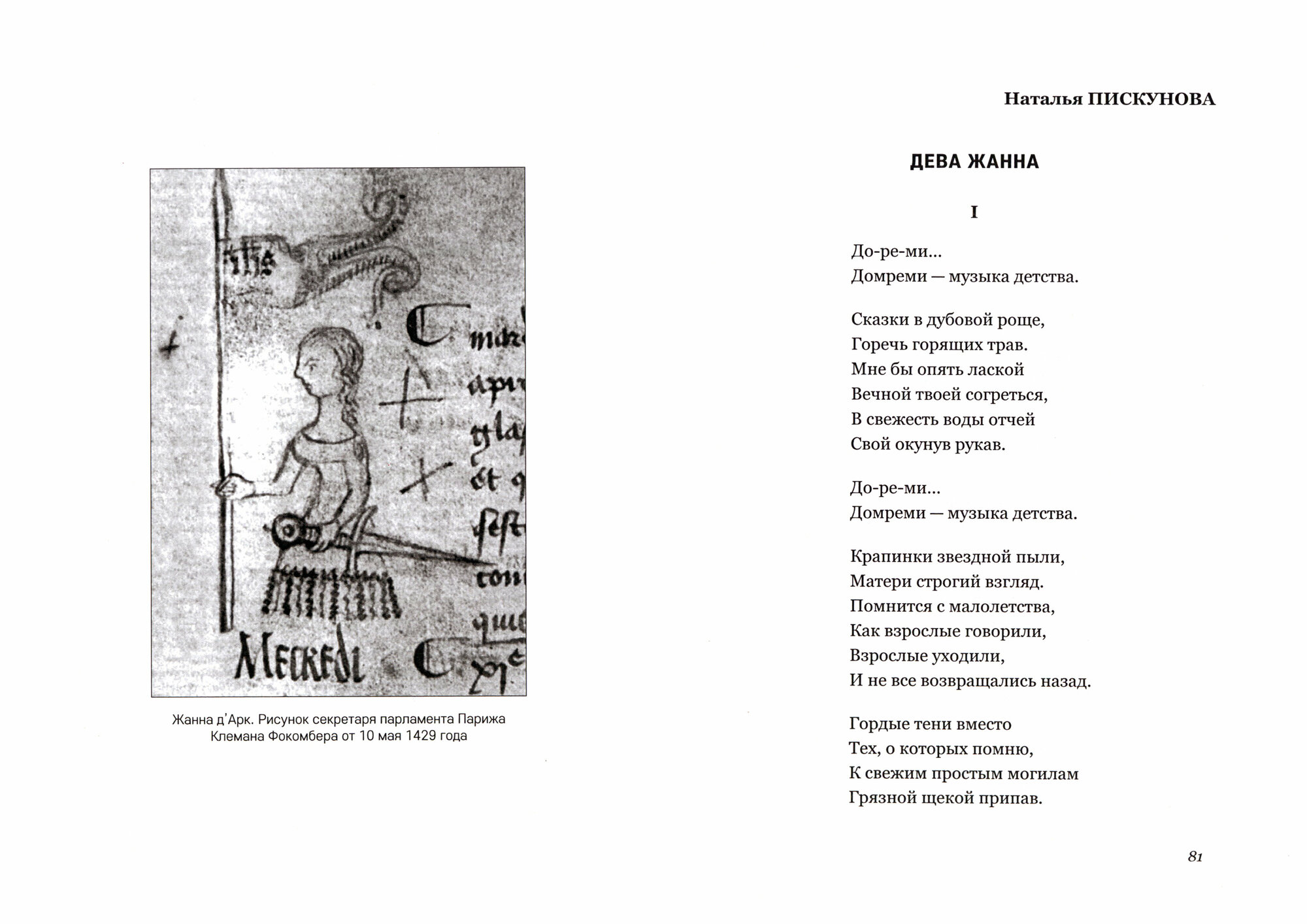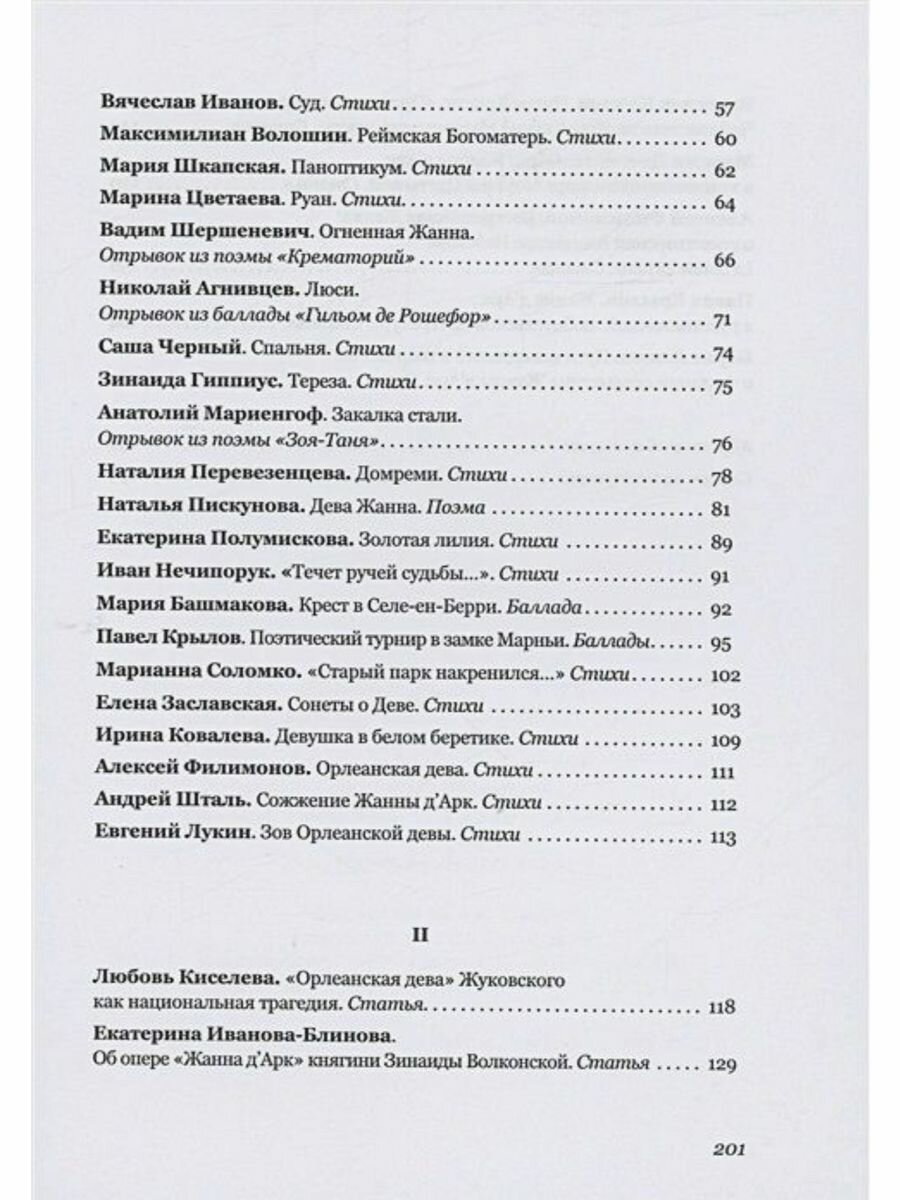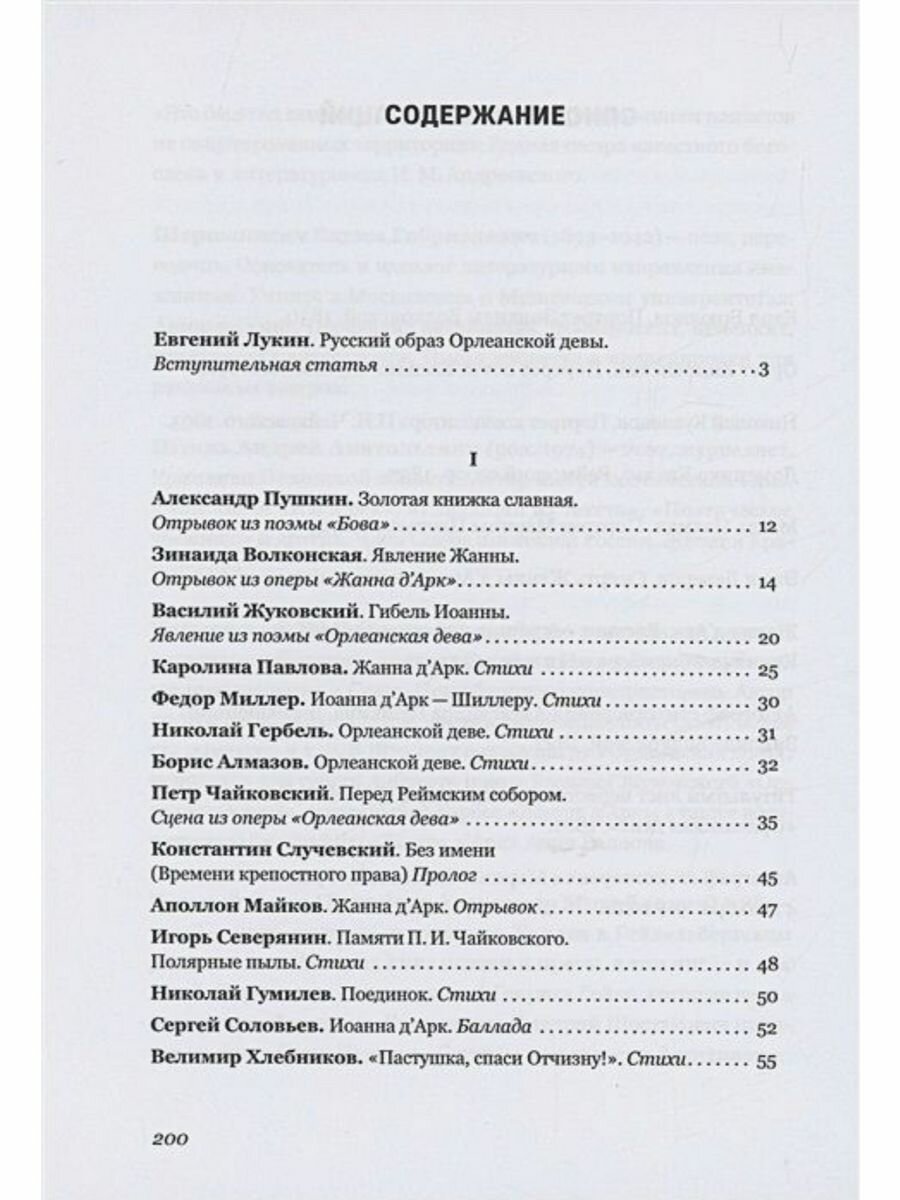 Однако есть среди участников антологии и малоизвестные авторы. К ним относится, например, княгиня Зинаида Волконская — поэтесса, певица, композитор, создавшая первую русскую оперу, посвященную Жанне д’Арк. Текст либретто этого сочинения публикуется в антологии. Венчают стихотворную подборку современные поэты из разных городов и областей России — Москвы, Санкт-Петербурга, Ставрополя, Самары и Донбасса, где сегодня проходит линия противостояния света и тьмы, добра и зла, где легендарный образ святой девы зовет в решительный бой, к великой победе.