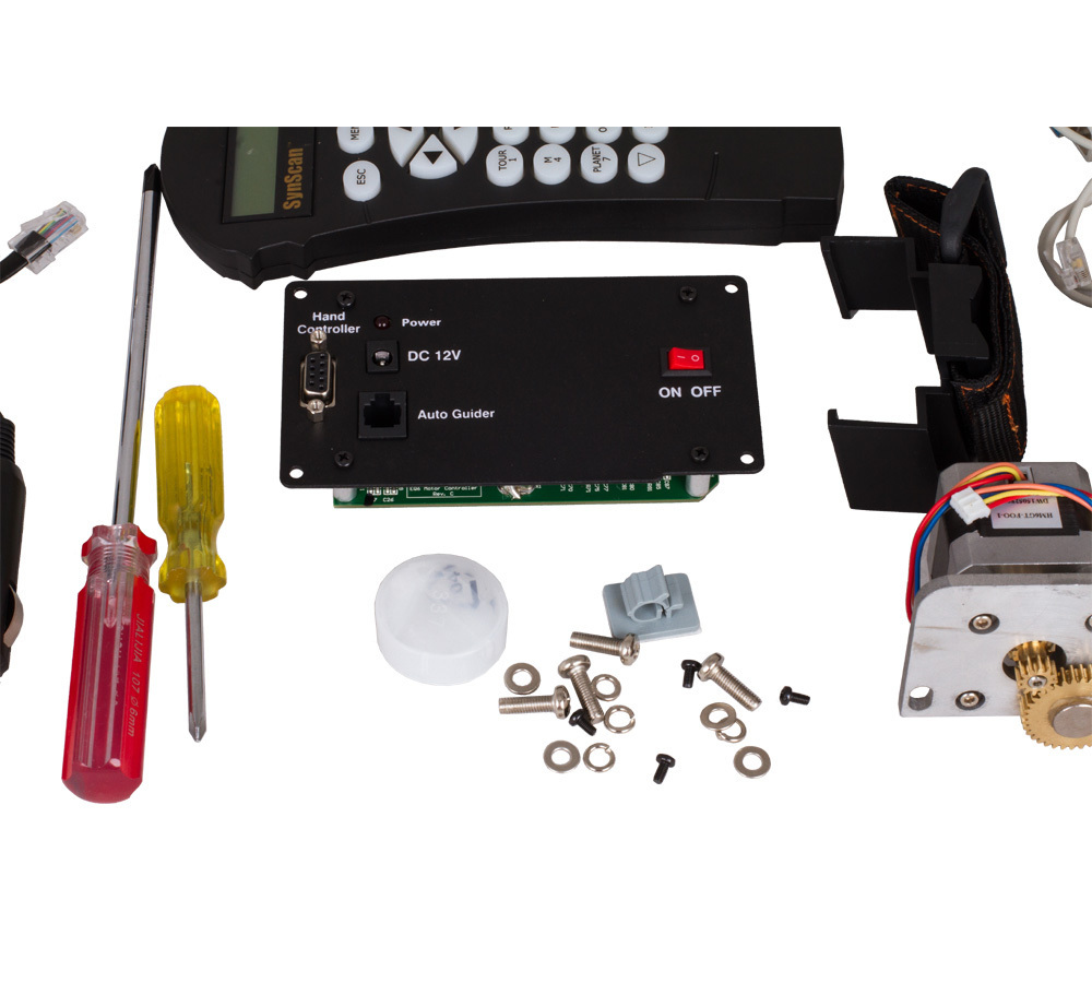 | Комплектация | моторный привод оси склонения, моторный привод оси прямого восхождения, пульт управления SynScan, кабель RS-232, кабель питания, держатель для пульта, контроллер электропривода, соединительный кабель, инструкция по эксплуатации и гарантийный талон |
