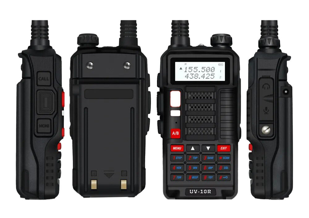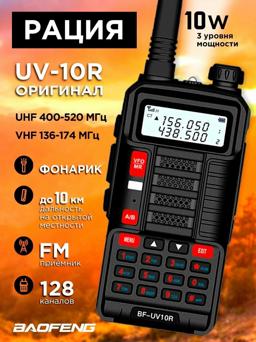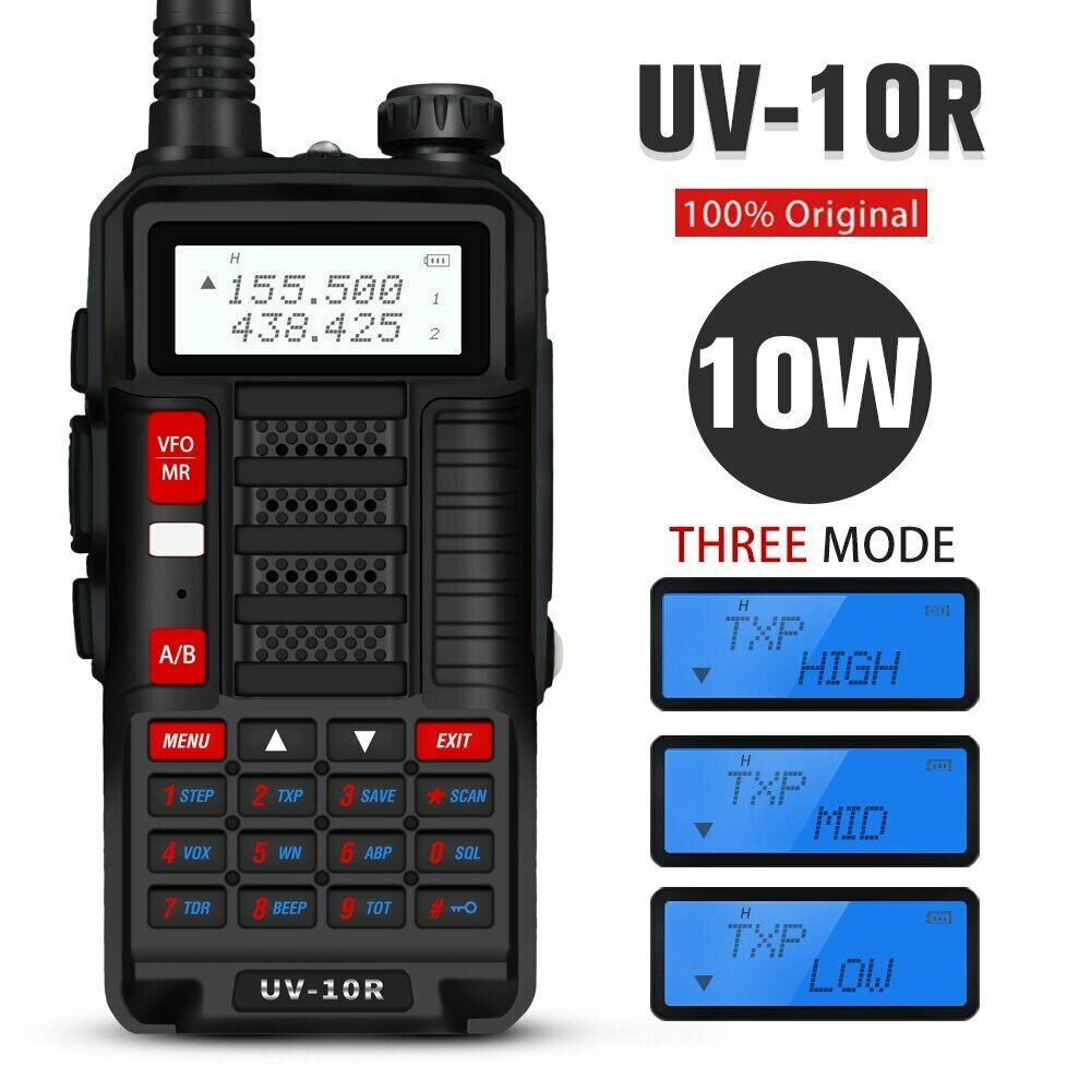 Baofeng UV-10R (TR-818UV) 10W - двухдиапазонная рация от компании Baofeng. Отличается корпусом оригинальным дизайном корпуса, тремя уровнями выходной мощности до 10W, и аккумулятором ёмкостью 2200 мАч с рабочим напряжением 7,4 Вольта. В радиостанции Baofeng TR-818UV установлен распространённый гарнитурный разъём типа "Kenwood". Он позволяет использовать множество совместимых гарнитур и выносных тангент для ведения переговоров без необходимости каждый раз извлекать рацию из кармана. Весь функционал рации может быть запрограммирован с компьютера с помощью "обычного" кабеля для программирования с К-разъемом. С её помощью можно настроить частотные каналы памяти, настройки шумоподавления, репитерные смещения частот приёма и передачи, включить или отключить функцию голосовых подсказок и многое другое.