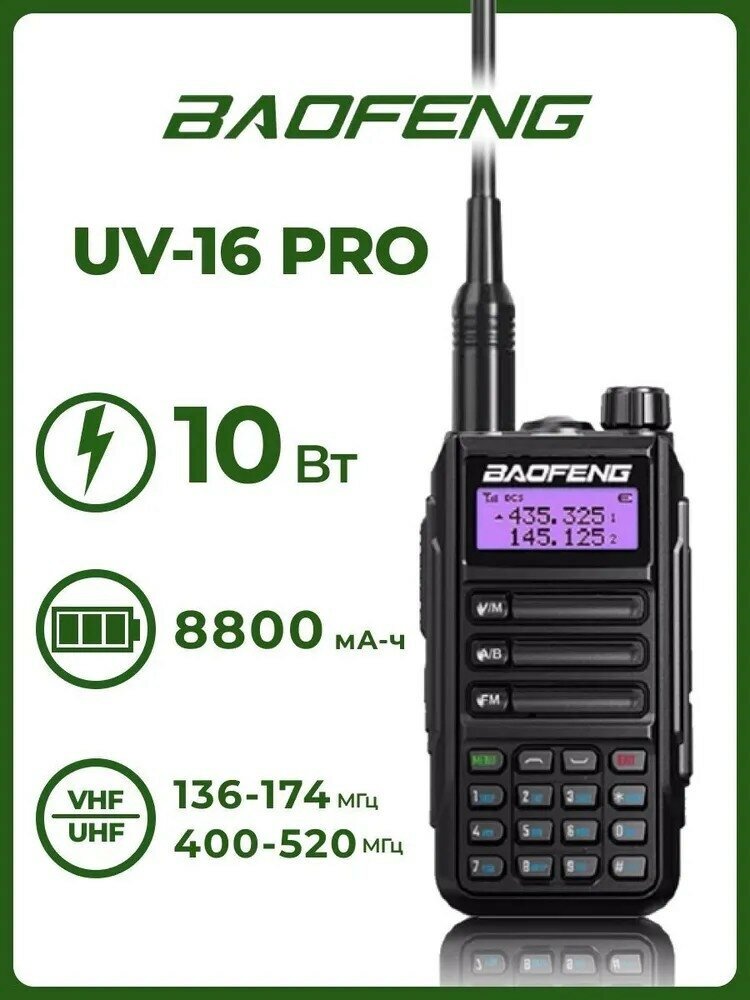 Радиостанция Baofeng UV-16 PRO - портативная рация для охоты, рыбалки, туризма, охранников и водителей. В комплекте: антенна, гарнитура, зарядка, ремешок, клипса. Это профессиональное устройство связи работает в двух диапазонах VHF 136 — 174 МГц и UHF 400-520 МГц, что позволяет легко соединять данную рацию с большинством других радиостанций на рынке. Может принимать сигнал одновременно на двух частотах. Количество каналов: 128, настраиваются с помощью программного кабеля. Рацию можно самостоятельно перепрошить, чтобы общаться на своих частотах, используя ее вместо телефона. Поддержка кодировки CTCSS/DCS защищает переговоры внутри группы от посторонних. Мощность 10 Вт позволяет вести переговоры на 5 км в густом лесу и на 10 км в условиях открытой местности. С помощью мощной дополнительной антены можно увеличить дальность связи до 40%. Качественный динамик, а также функция шумоподавления обеспечивают хорошую разборчивость речи даже на дальних расстояниях. Для удобства можно подключить тангенту. Аккумулятор емкостью 8800 мАч позволяет работать в автономном режиме до 48 часов. Также можно взять переносное зарядное устройство, чтобы заряжать аккумуляторную батарею в походных условиях. Имеется индикатор заряда и режим сохранения энергии. Благодаря хорошей водозащите IP68 радиостанция Баофенг подходит для лесных и речных походов. Модель устойчива к попаданию воды и грязи, не выйдет из строя под дождем. Радиостанция Baofeng UV-16 PRO - отличный подарок на день рождения, Новый год или другие праздники. Вес устройства всего 250 г, оно удобно помещается в сумку или подсумок, приятно лежит в руке. Рацию можно недорого доукомплектовать набором аксессуаров: наушниками, гарнитурой, микрофоном, держателем или другим креплением.