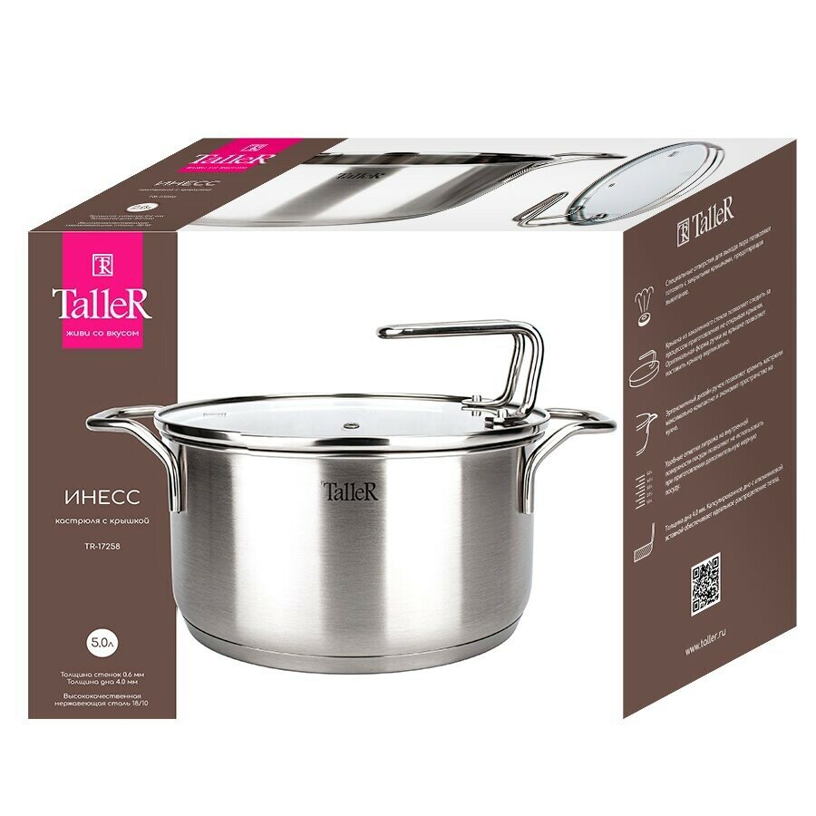На сегодняшний день товар «кастрюля TALLER Инесс 5л 24см нерж.сталь стеклянная крышка индукция TR-17258» можно купить с кешбеком в 1 магазине: Яндекс.Маркет