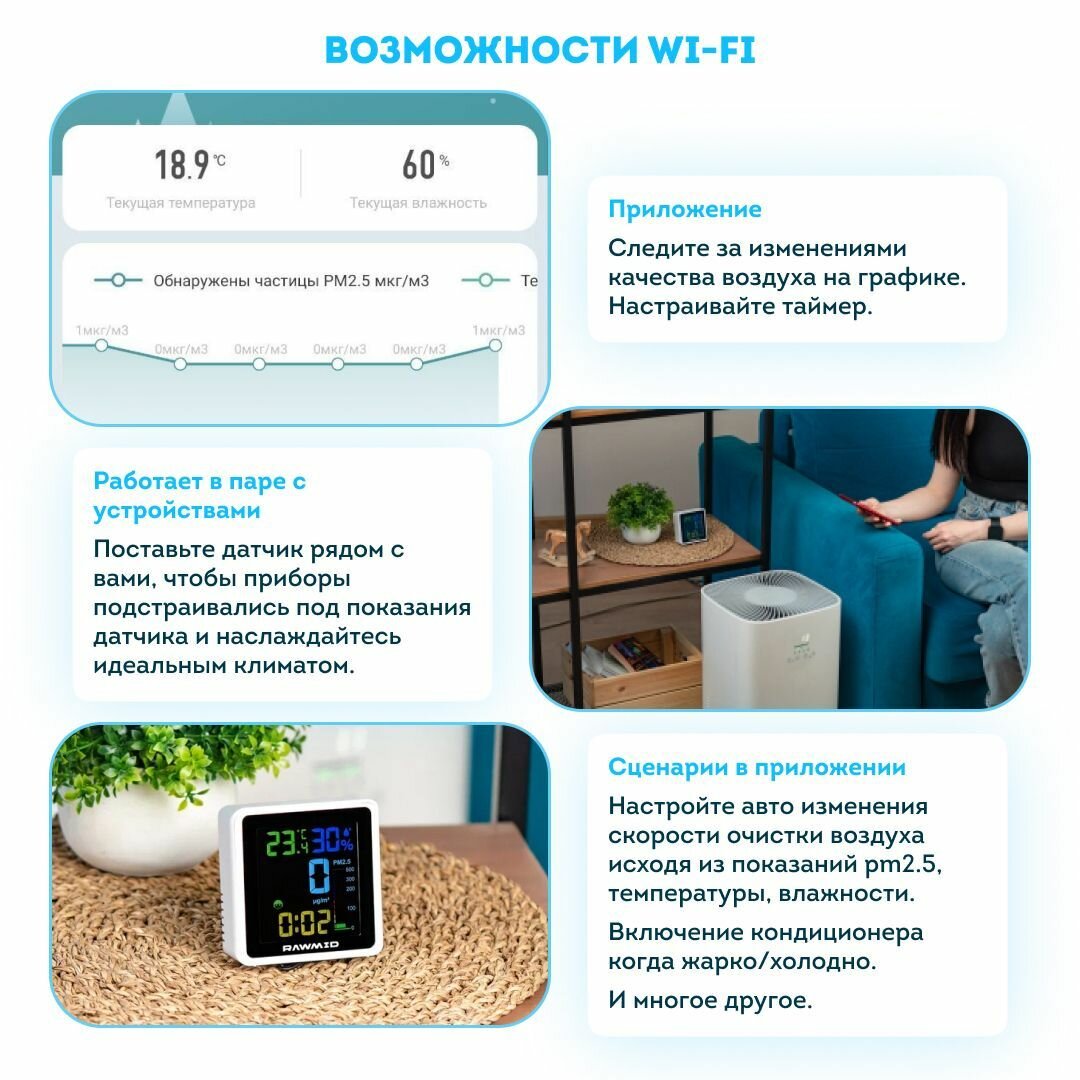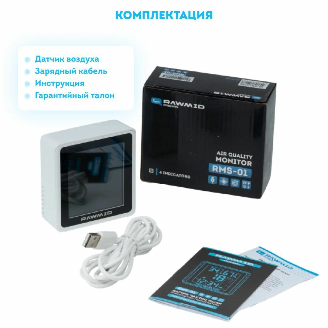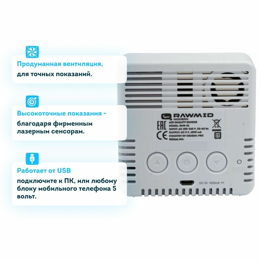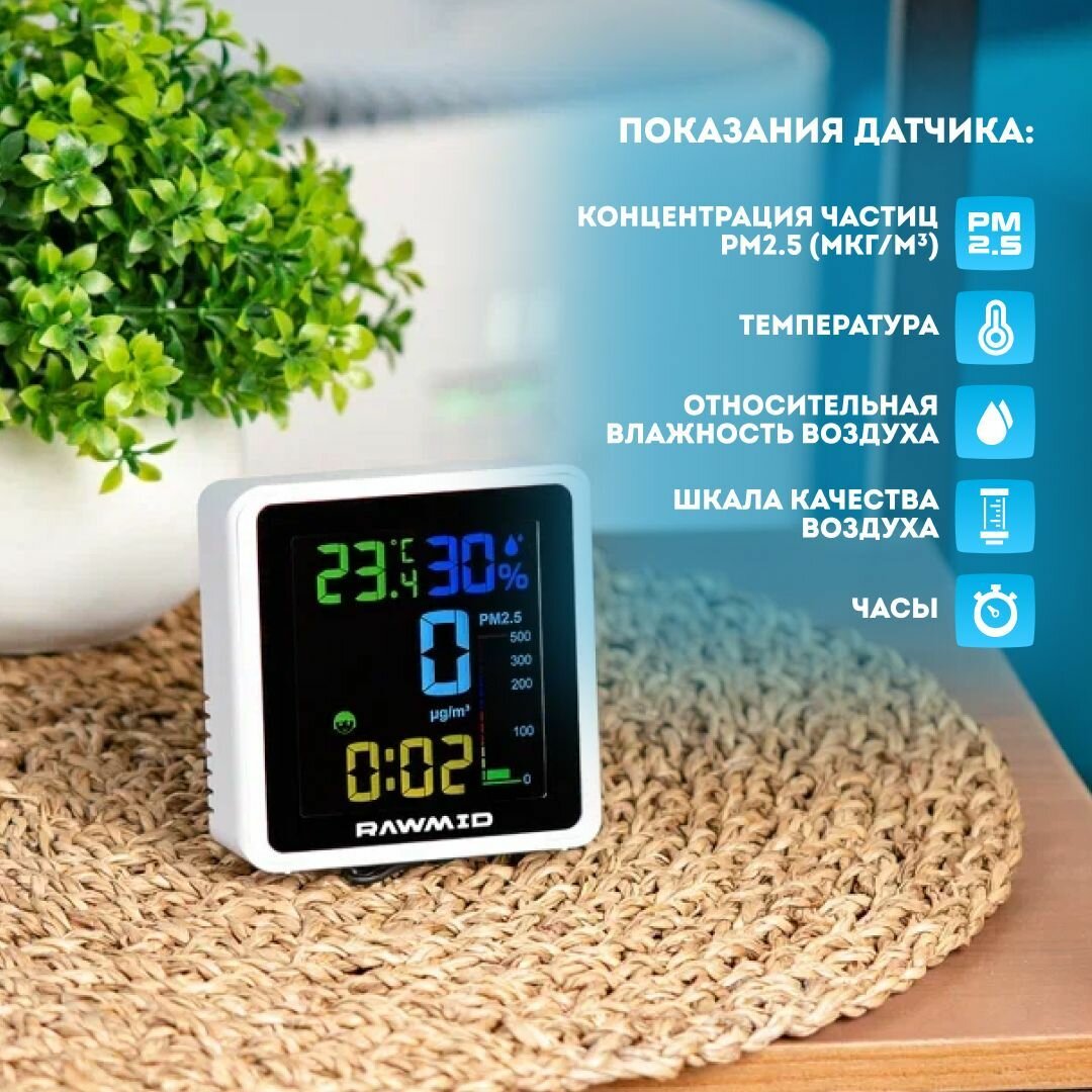 Датчик качества воздуха RAWMID Modern RMS-01 позволяет следить за 3 показателями: — концентрация частиц PM2.5 (мкг/м³) — температура — относительная влажность воздуха.Дополнительная функция: отображение текущего времени.На дисплее отображается не только концентрация частиц PM2.5, но и оценка качества воздуха посредством цветной шкалы.В устройстве нет встроенного аккумулятора, оно работает от USB-кабеля (входит в комплект). Его можно подключить к сети через адаптер питания, к USB-разъёму компьютера или ноутбука или к внешнему аккумулятору.Датчик RAWMID RMS-01 можно подключить к сети Wi-Fi и следить за показаниями на смартфоне. А через приложение Smart Life можно соединить датчик с другими климатическими устройствами, внедрив датчик в систему умного дома.