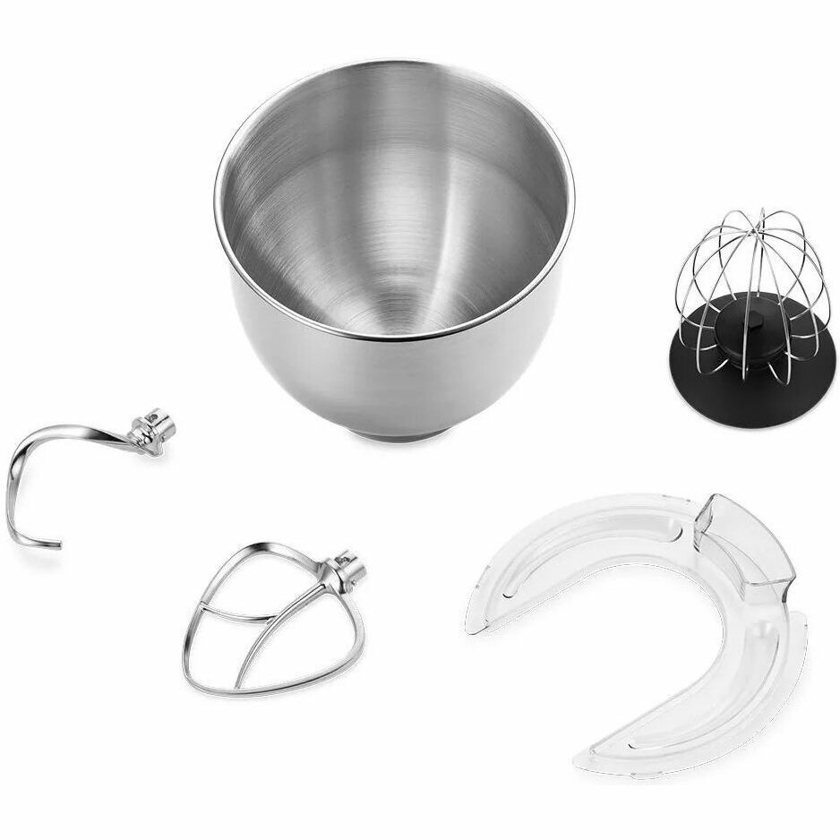 | Прочие особенности и свойства | Чаша миксера выполнена из нержавеющей стали и имеет ёмкость 5,7 литров. В комплекте идут насадки для взбивания, смешивания и замеса крутого теста, а также защитный кожух, который защищает шпиндель от налипания продуктов. |