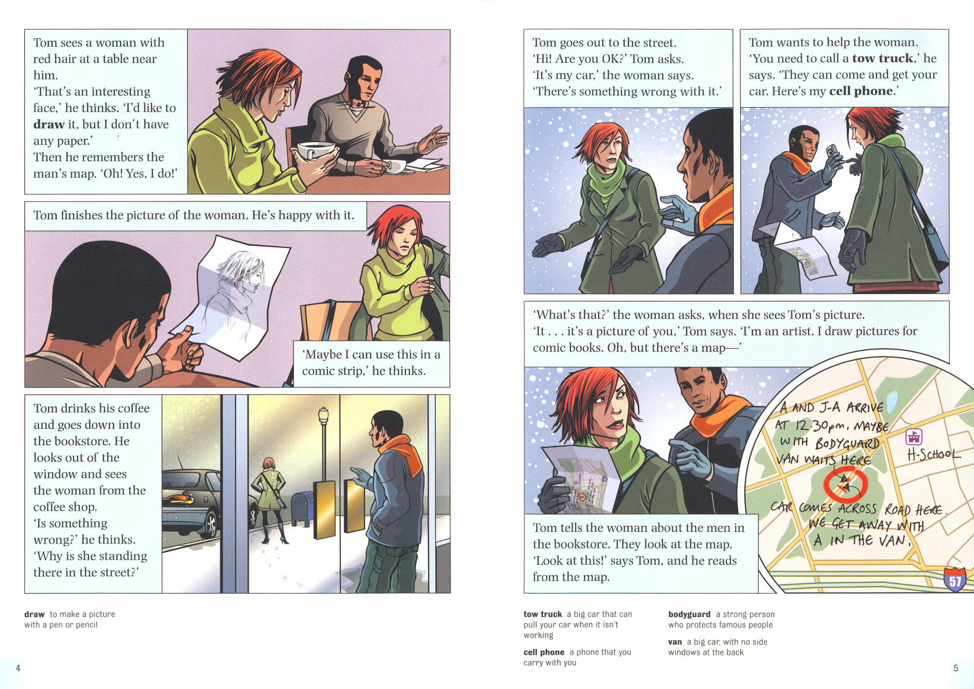 A blue van is waiting for them. Tom is in the van, but he's not a kidnapper - he's an artist. He usually draws pictures for adventure stories. Now he's in a real life adventure.