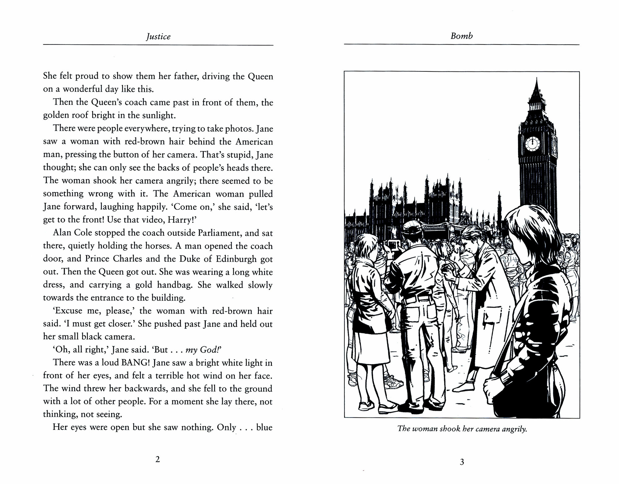 London: November. Terrorists blow up the Queen's coach outside Parliament. The Queen escapes, but five people are killed, and forty others badly hurt - ordinary, innocent people, like Alan Cole, the Queen's coachman, who loses his leg in the bombing. And for Alan and his daughter Jane there is more terror to come, in the search for the truth behind the bombing. Will the terrorists be caught and brought to justice? But what kind of justice? What can give Alan Cole his leg back, or give life back to people who have been blown to pieces by a bomb?