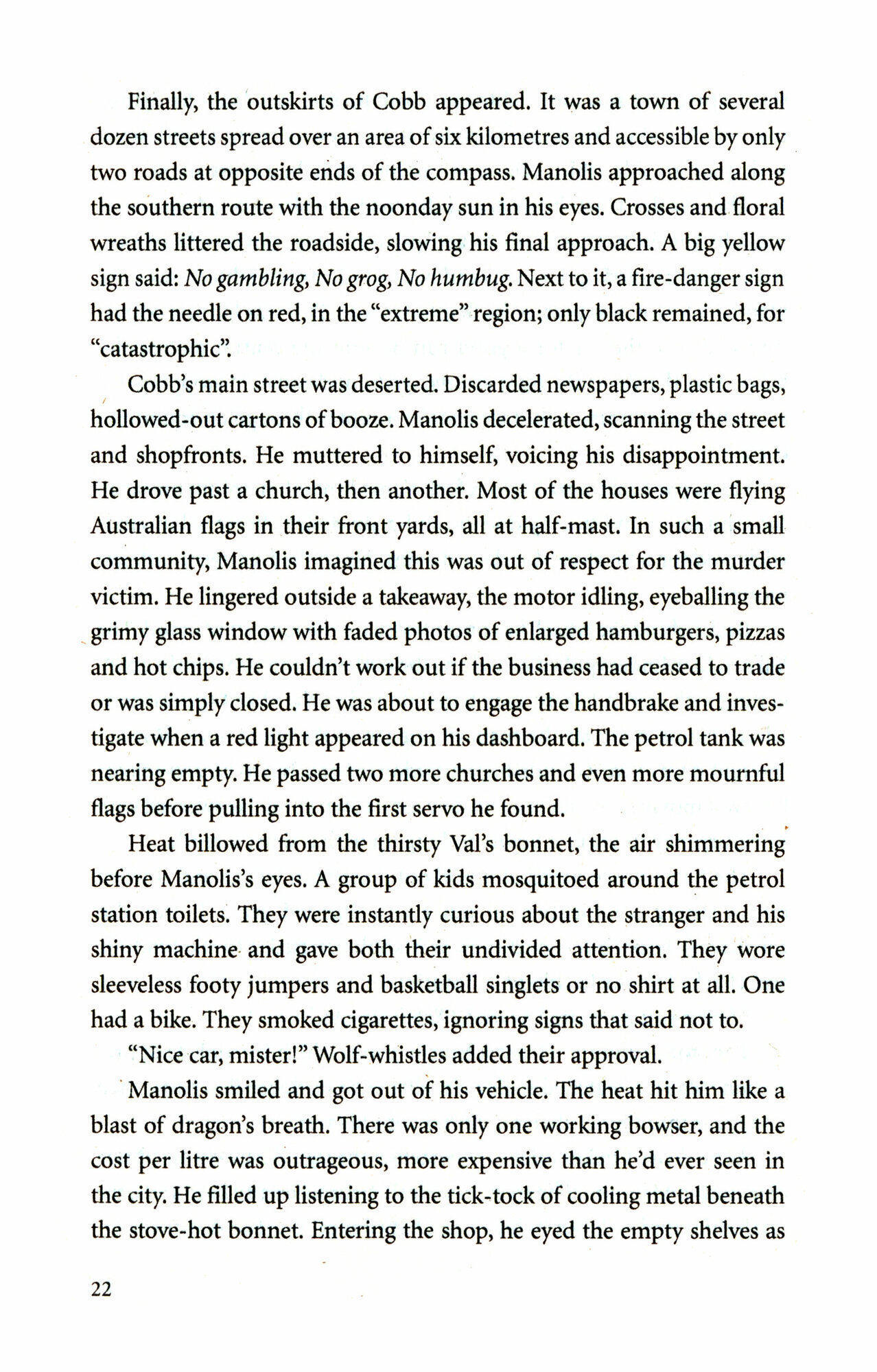 Still mourning the recent death of his father, Detective Sergeant George Manolis returns to his childhood hometown to investigate. Within minutes of his arrival, it’s clear that Cobb is not the same place he left. Once it thrived, but now it’s a poor and derelict dusthole, with the local police chief it deserves. And as Manolis negotiates his new colleagues’ antagonism, and the simmering anger of a community destroyed by alcohol and drugs, the ghosts of his past begin to flicker to life.