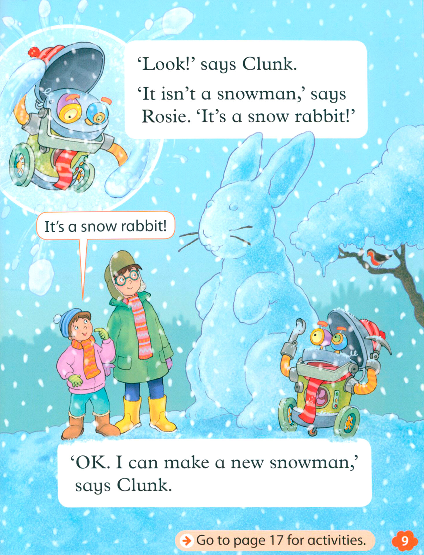 There's snow today! Ben and Rosie make a big snowman. Can Clunk the robot make a snowman?