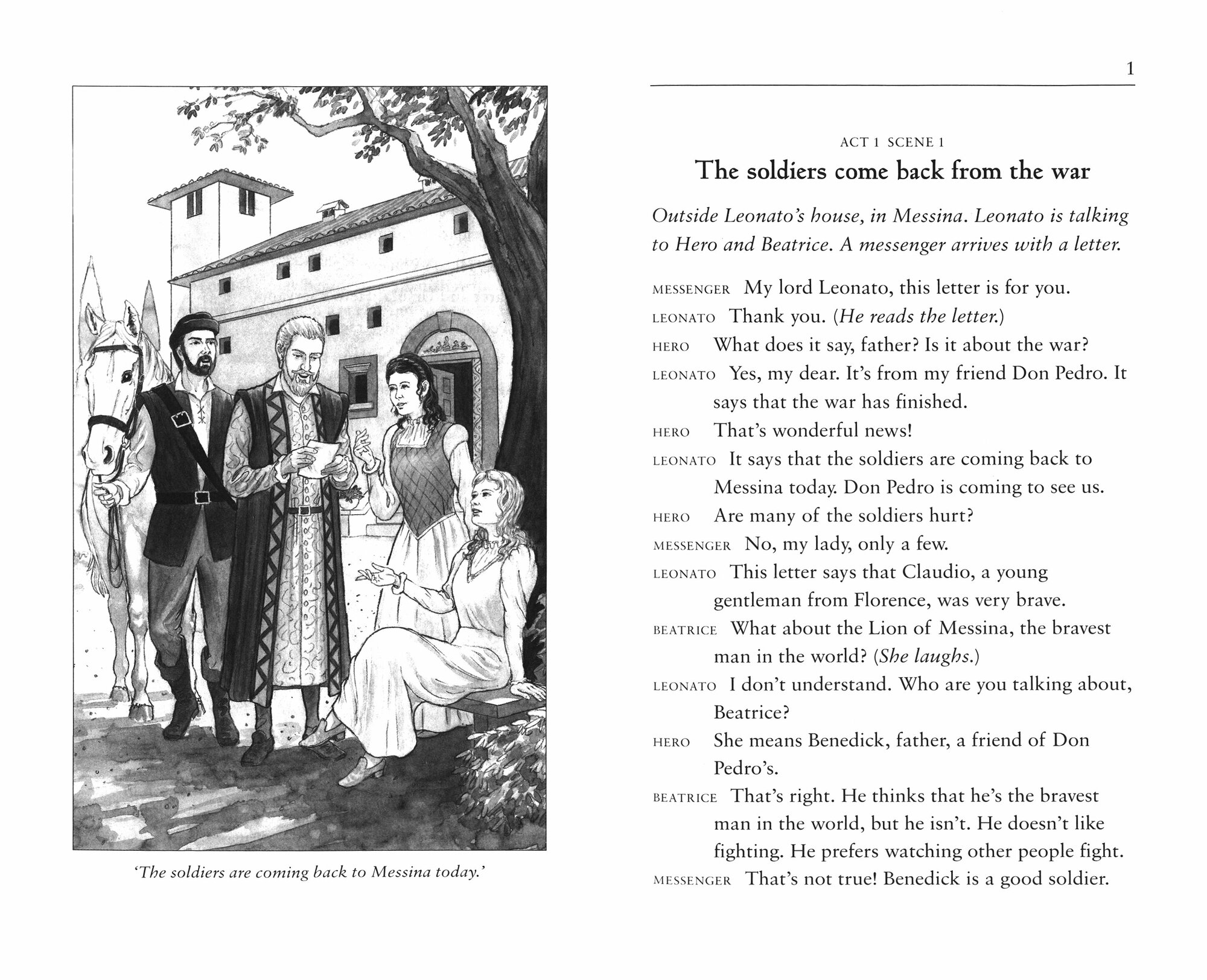 There are two love stories in this fast-moving comedy. Brave young Claudio and Leonato's pretty daughter Hero are in love and want to marry, but Don John has a wicked plan to stop their wedding. Will he succeed, or will the truth come out? Will Claudio and Hero marry, after all? Beatrice and Benedick are always arguing with each other, but how do they really feel? Perhaps they are more interested in each other than they seem to be! Their friends work hard to bring them closer together.