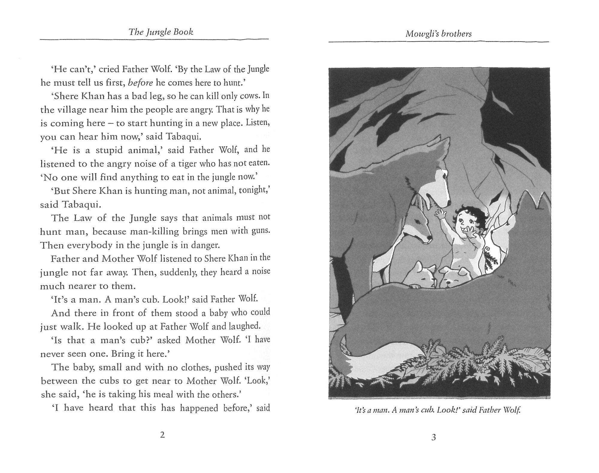 In the jungle of Southern India the Seeonee Wolf- Pack has a new cub. He is not a wolf - he is Mowgli, a human child, but he knows nothing of the world of men. He lives and hunts with his brothers the wolves. Baloo the bear and Bagheera the panther are his friends and teachers. And Shere Khan, the man-eating tiger, is his enemy. Kipling's famous story of Mowgli's adventures in the jungle has been loved by young and old for more than a hundred years.