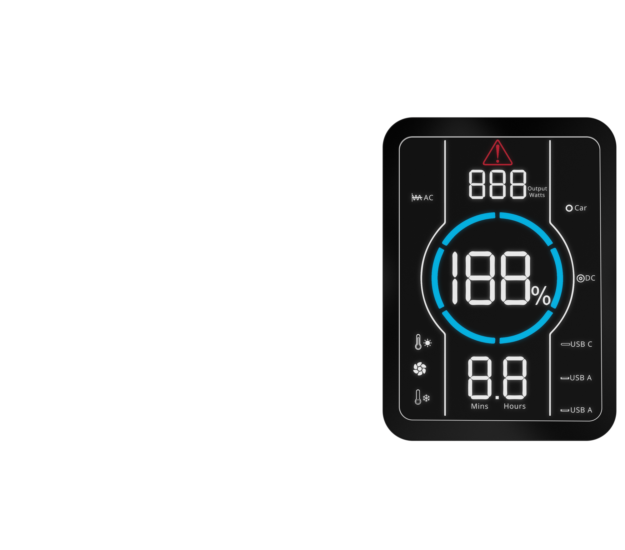 Розетка переменного тока с чистым синусом (Pure Sine Wave) гарантированно обеспечит бесперебойную и безопасную работу электроустройств мощностью 600W, например, офисную и домашнюю технику, электроинструменты, а так же медицинское оборудование. Автомобильная розетка мощностью 120W поддерживает питание наружного освещения и различных аксессуаров для автомобиля, таких как насос, холодильник, или термос. Два универсальных 12V DC порта предназначены для зарядки аккумуляторов квадрокоптеров и дронов, а так же питания совместимых устройств. Мощный USB Type-C PD 60W быстро зарядит современный ноутбук, планшет или смартфон, а два независимых USB QC 3.0 18W, поддерживающих одновременную быструю зарядку, пополнят запас автономности других гаджетов.