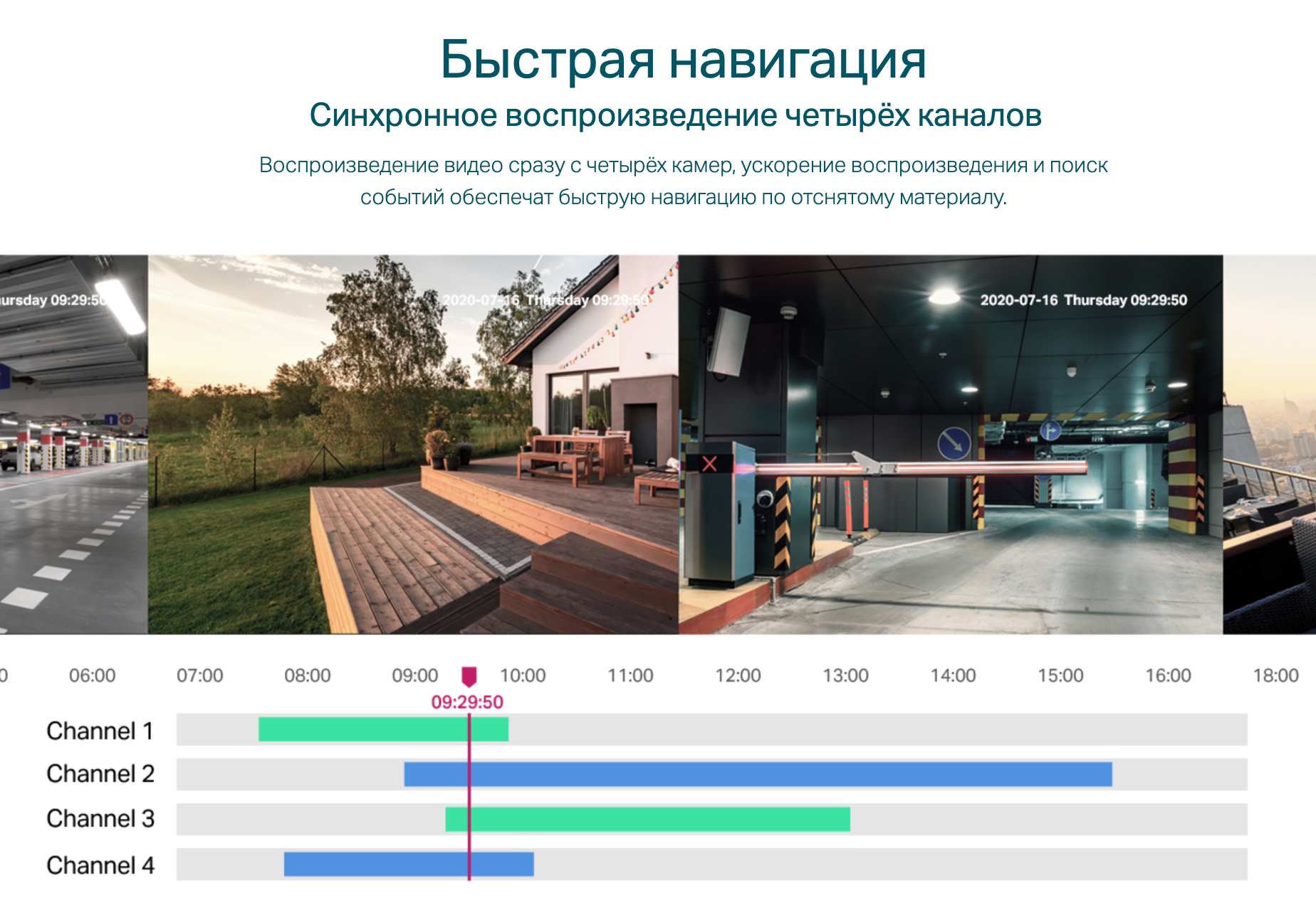 - Синхронное воспроизведение: одновременное воспроизведение с четырёх камер4, а также возможность увеличения скорости воспроизведения и поиска событий для быстрой навигации по отснятым материалам.