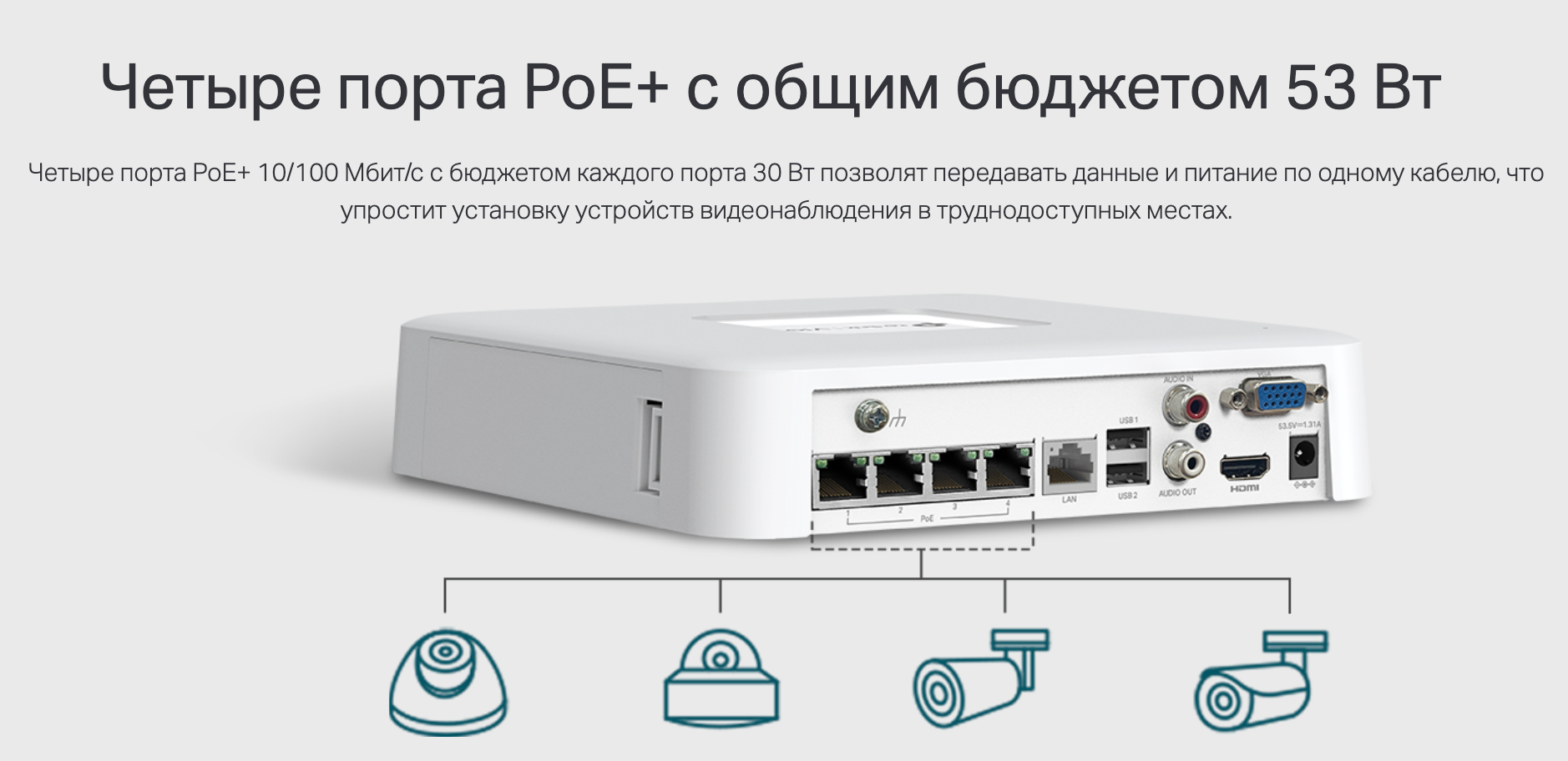 - Упрощённое развёртывание благодаря PoE+: подключайте камеры с помощью одного кабеля RJ45, по которому будут передаваться как данные, так и питание — адаптер не нужен.