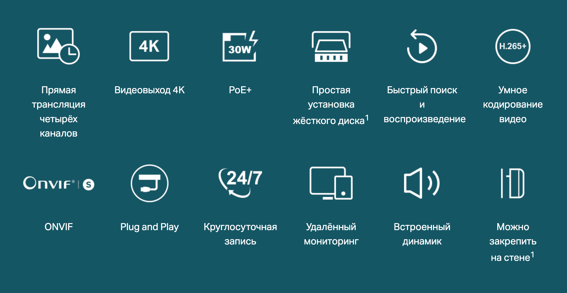 - Видеовыход HDMI 4K и декодирование до 16 Мп: поддержка высокого разрешения и возможность отображения до четырёх каналов позволят разглядеть каждую деталь с любого ракурса2.
