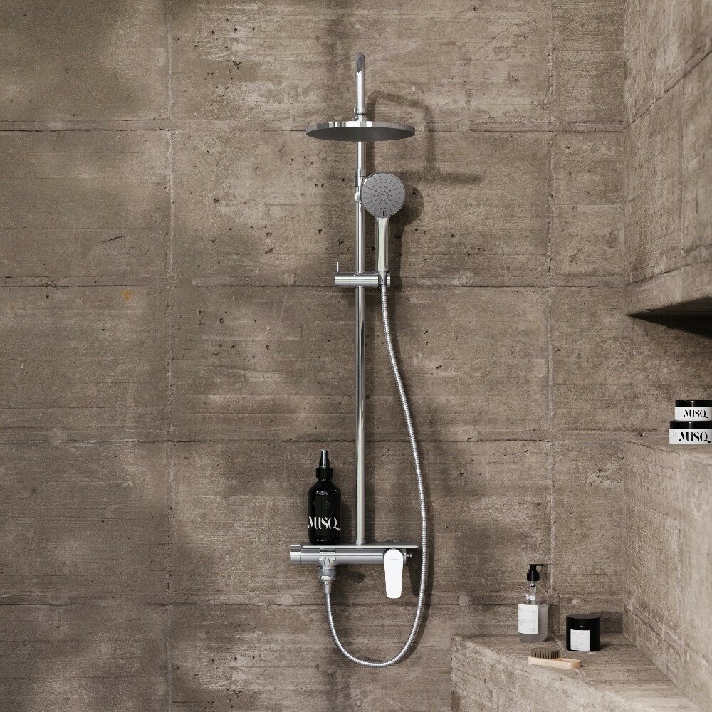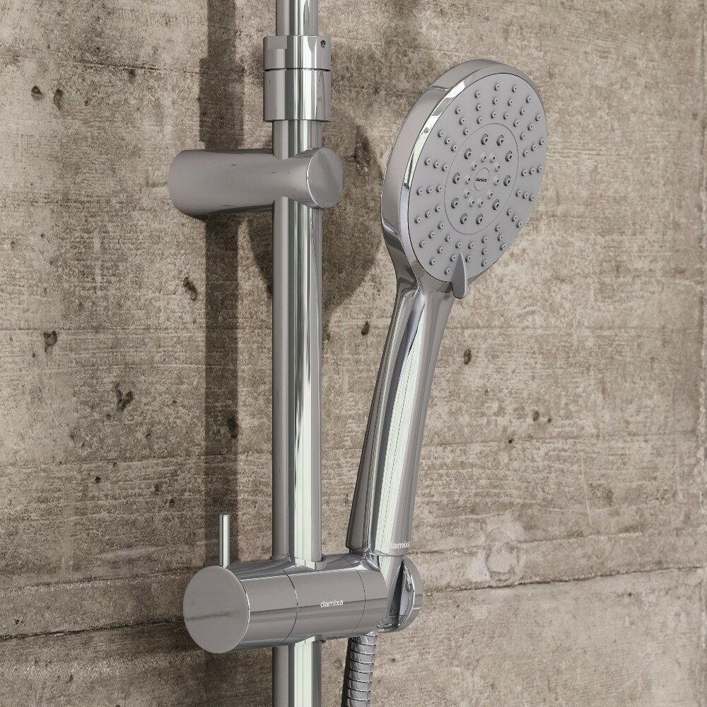Душевая стойка Damixa Jupiter 977730000, штанга; верхний установочный крепеж 1 шт.; корпус смесителя; эксцентрические переходники 2 шт.; верхний душ; ручной душ; держатель ручного душа; шланг 1500 мм; комплект крепления; иструкция.