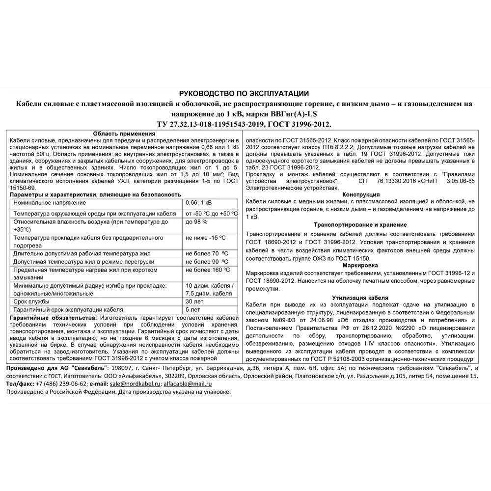 **Кабель Севкабель ВВГнг-LS** - трехжильная модель. Предназначен для передачи и распределения электроэнергии в стационарных установках при переменном напряжении в 0,66 кВ. Используется при строительстве зданий жилого и общественного назначения, на объектах атомной энергетики и метрополитена. Модель оснащена прочной ПВХ изоляцией пониженной пожароопасности, имеет внутренние и наружные оболочки из ПВХ-пластификата.