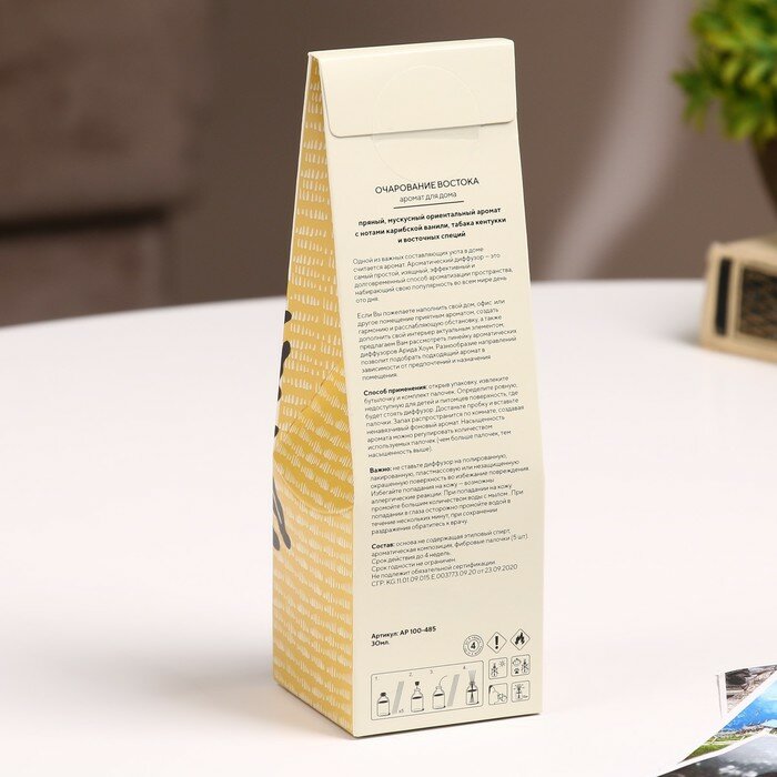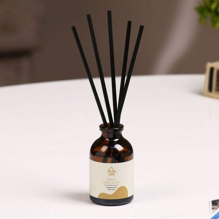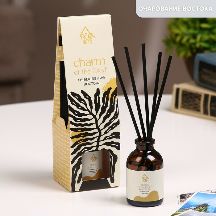 **Ароматический диффузор Arida Home Очарование востока** - простое и удобное решение, при помощи которого за считанные минуты можно наполнить помещение (жилое или офисное) ненавязчивым приятным ароматом. Способствует формированию уютной и расслабляющей обстановки. Характеризуется простотой использования. Достаточно установить бутылочку на ровную поверхность, недоступную для детей и питомцев, и поместить в нее палочки - при помощи количества последних можно регулировать интенсивность аромата. Во избежание повреждений не рекомендуется ставить диффузор на следующие поверхности: полированную, лакированную, пластмассовую или незащищенную окрашенную.