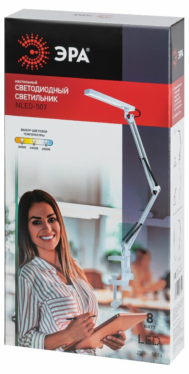 Рабочая лампа настольная светодиодная Эра NLED-507-8W-W на струбцине цвет белый с регулировкой яркости Б0058337