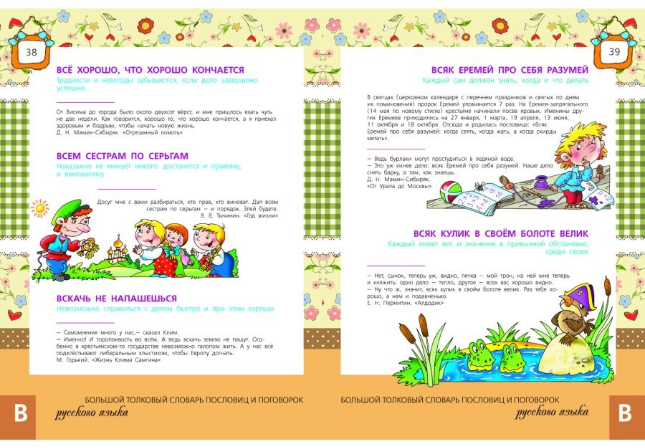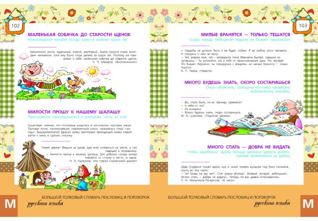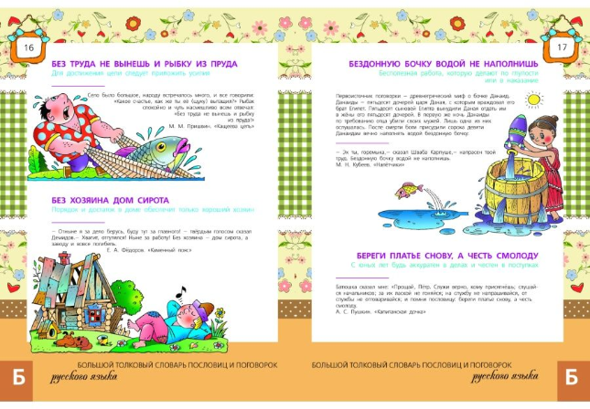 «Большой толковый словарь пословиц и поговорок русского языка для детей» — это уникальное иллюстрированное издание для детей младшего и среднего школьного возраста, их родителей, а также всех, кто интересуется русским языком и литературой. Изучающие русский язык иностранцы с помощью словаря быстрее овладеют культурно-историческими особенностями русской речи.