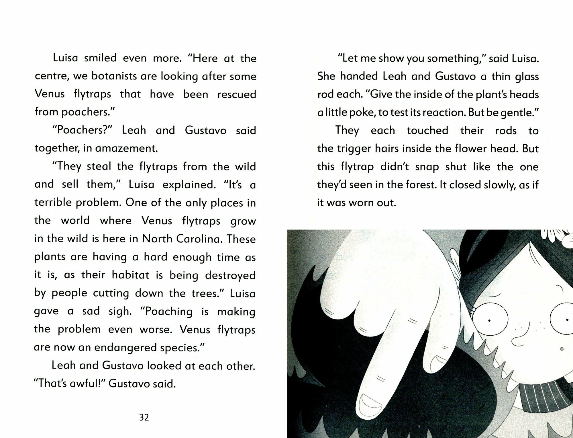 In this fun, fact-filled children's book, Leah the biology expert and Gustavo the history buff are whisked away on a mission to a forest in North Carolina, USA. There, they meet a botanist working to protect the amazing Venus flytrap - an endangered species of plant - from being stolen by poachers and sold for money. It'll take every bit of brainpower, bravery, and expertise that Leah and Gustavo have to stop the poachers and rescue the plants. Let's explore!