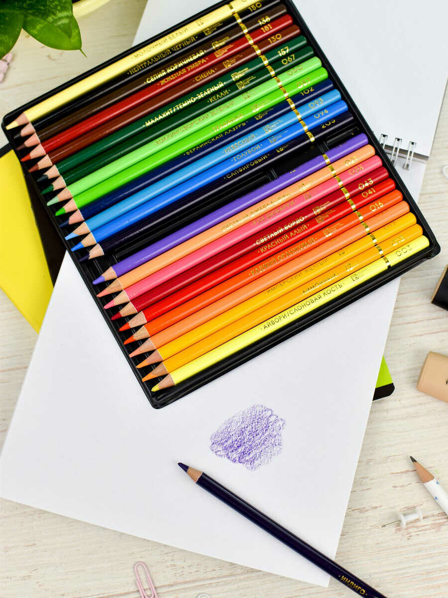 Упаковка: картонная коробка с европодвесом, выборочным лаком и золотистым тиснением, пластиковая подложка для карандашей.