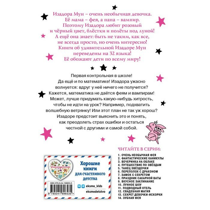 Первая контрольная в школе! Изадора ужасно волнуется: вдруг у неё ничего не получится? Кажется, математика не даётся феям и вампирам! Может, лучше придумать какую-нибудь хитрость, чтобы не идти в этот день на урок? Например, подхватить волшебную ветрянку! Или этот план не так уж хорош? Изадоре предстоит выяснить, как преодолеть трудности и остаться честной с другими и самой собой.